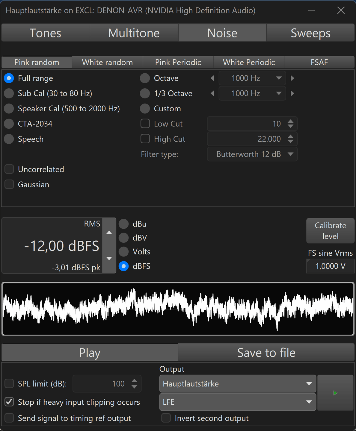 8. Sobald alles bereit ist, kannst du im Generator nun auf Play unten links drücken und das pinke rauschen wird an die LFEs geschickt.