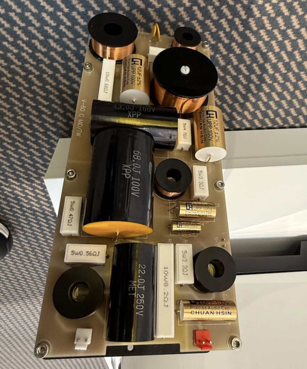 Sogar die Bauteile auf derFrequenzweiche sind Chinesischer Herkunft. CHUAN HSIN Kondensatoren.