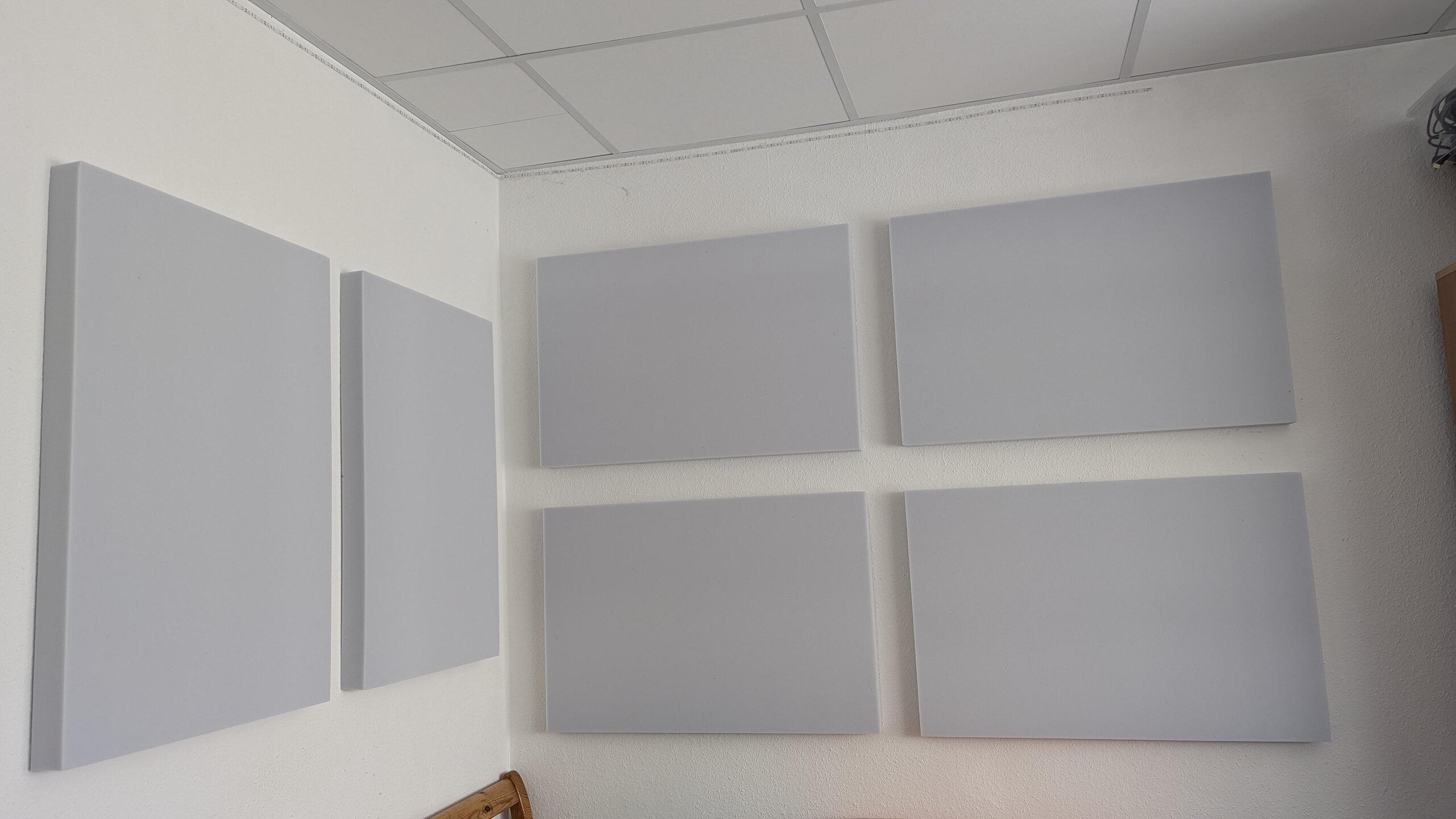 Hinten, die 6 basotect Absorber, 5cm sind wegen des widerlichen Flatterechos/Halls. Seitdem ich die 6 Absorber hinten an der Wand habe, zischt und halt und echot nix mehr. Das merkt man extrem beim Husten, Niesen oder wenn man was auf den Boden fallen lässt. Jetzt ist die Atmosphäre ganz anders.