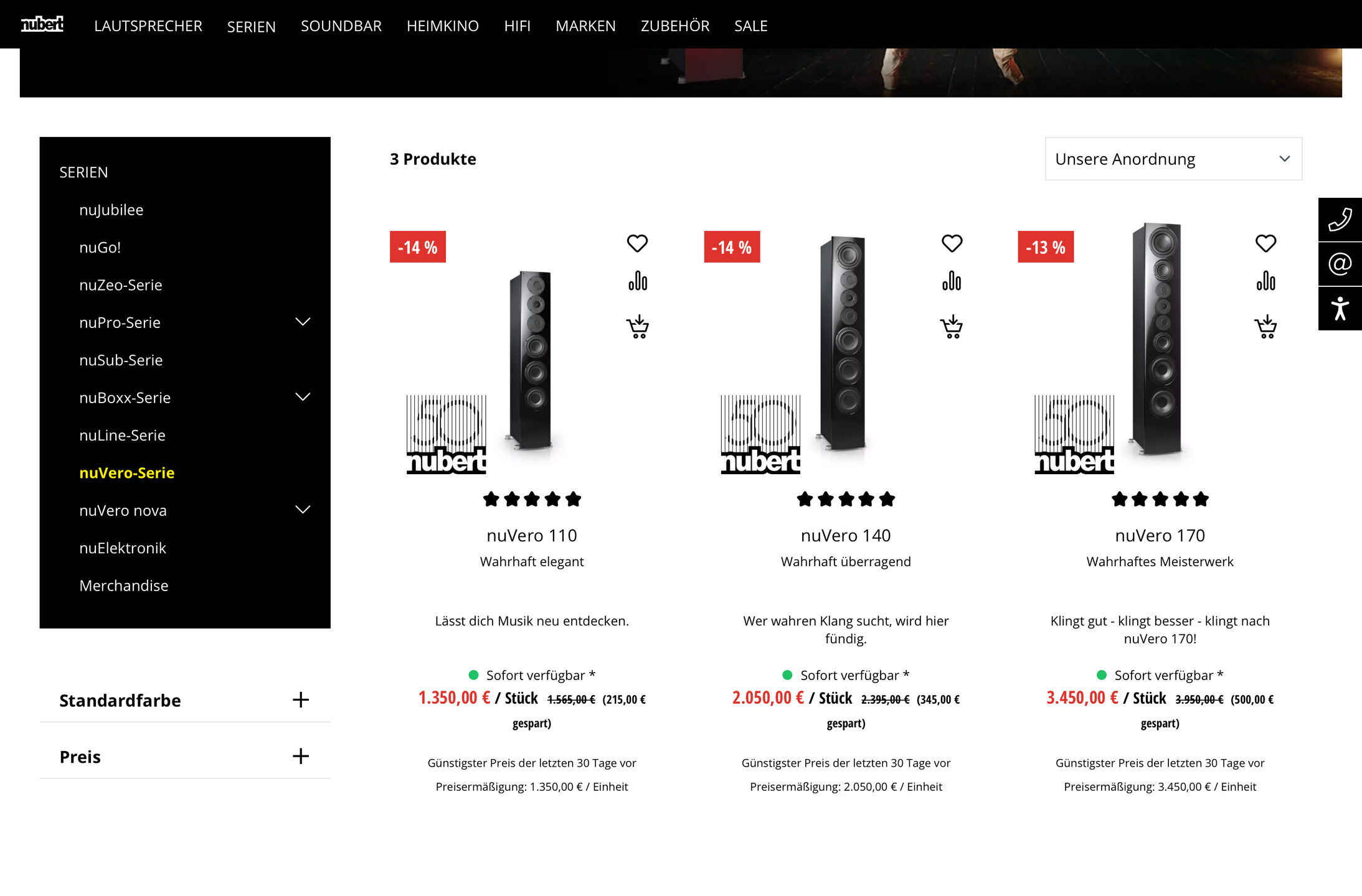 Die drei nuVero Gen 2 (ab 2015) Standlautsprecher gibt‘s inzwischen mit ordentlichen Rabatt. Ein paar nV170 zB. für immerhin 6900 Euro, meiner Meinung nach kommt man kaum günstiger an neue Lautsprecher mit diese Klangqualität.