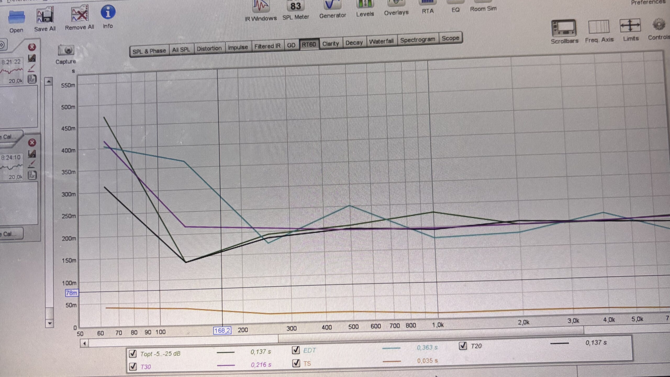 Schön zu sehen, wie die „Bio Absorber“ im Oberbass-Bereich wirken, aber auch im höheren Frequenzspektrum zur Beruhigung beitragen. Eigentlich müsste man eine Audyssey-Einmessung oder dergleichen im Heimkino stets mit einem Full House durchführen.