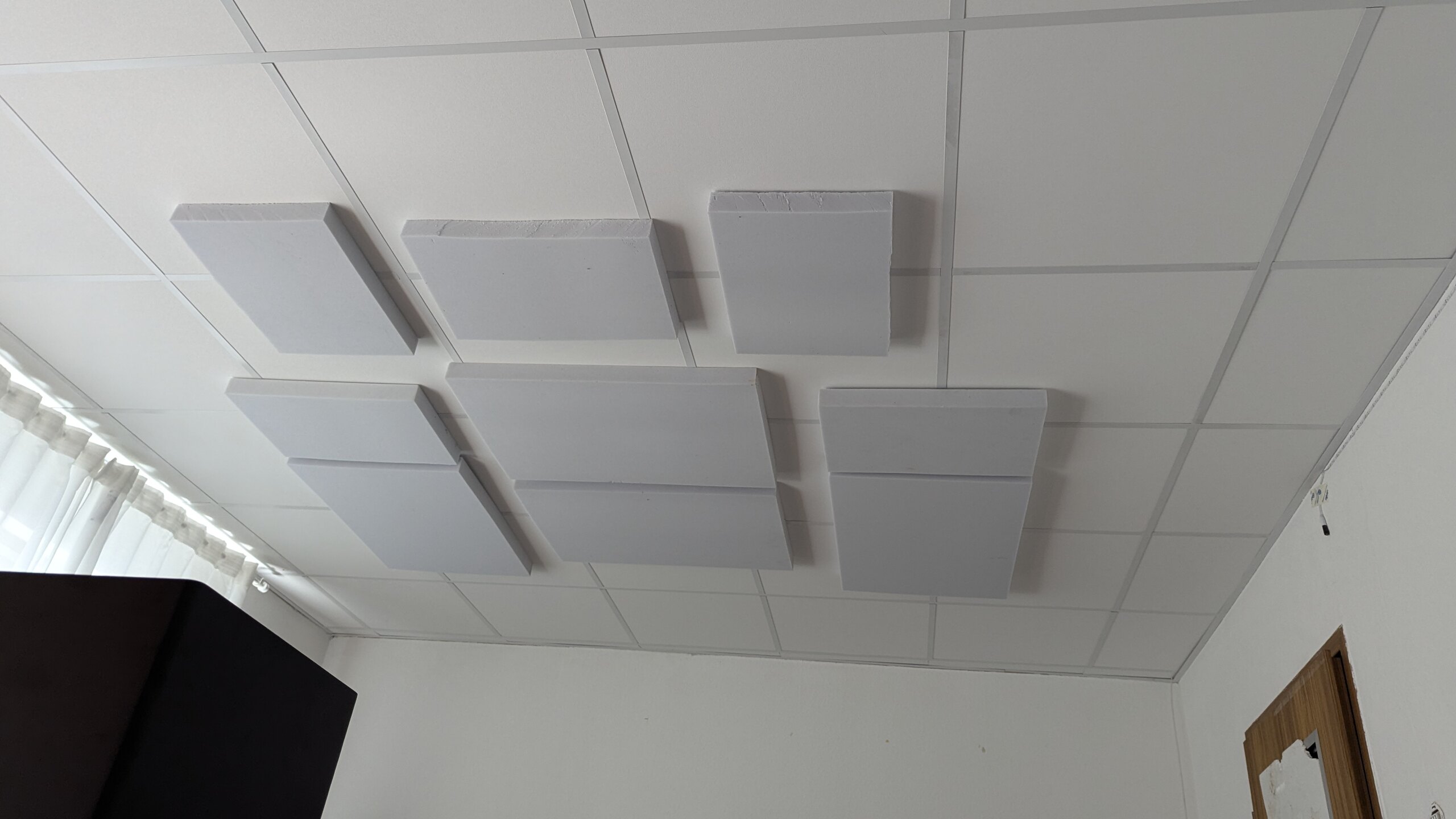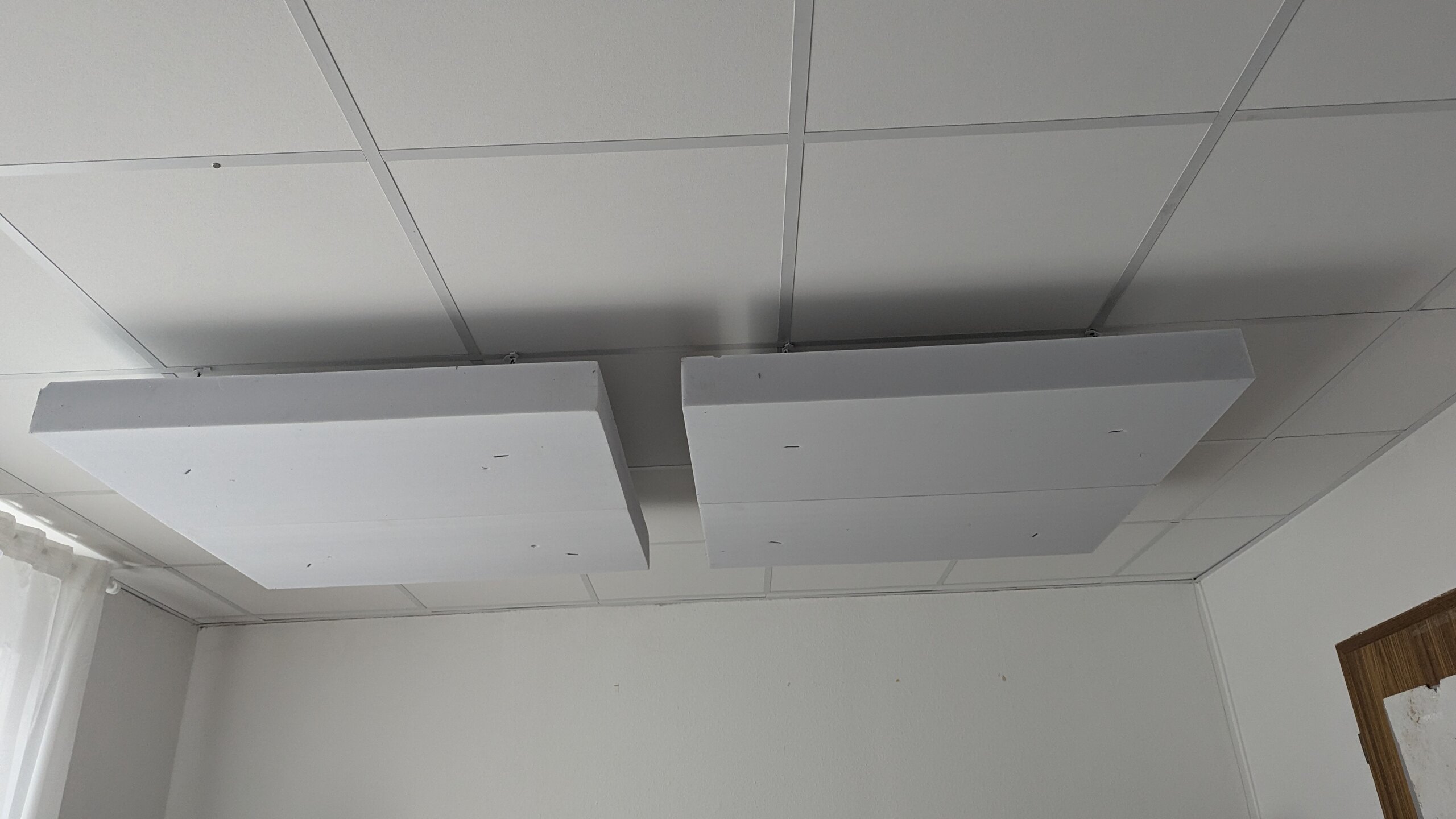 Subwoofer ist wieder weg. Heute morgen um 4 Uhr habe ich Deckensegel gebaut und aufgehängt. 2m², 10cm Dicke, 10cm Luft zwischen decke und Deckensegel.