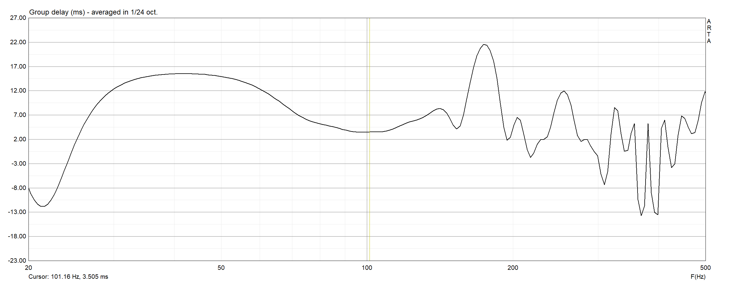 In der Gruppenlaufzeit sehen wir ein recht flottes, dafür breitbandiges Verhalten unterhalb 60Hz,