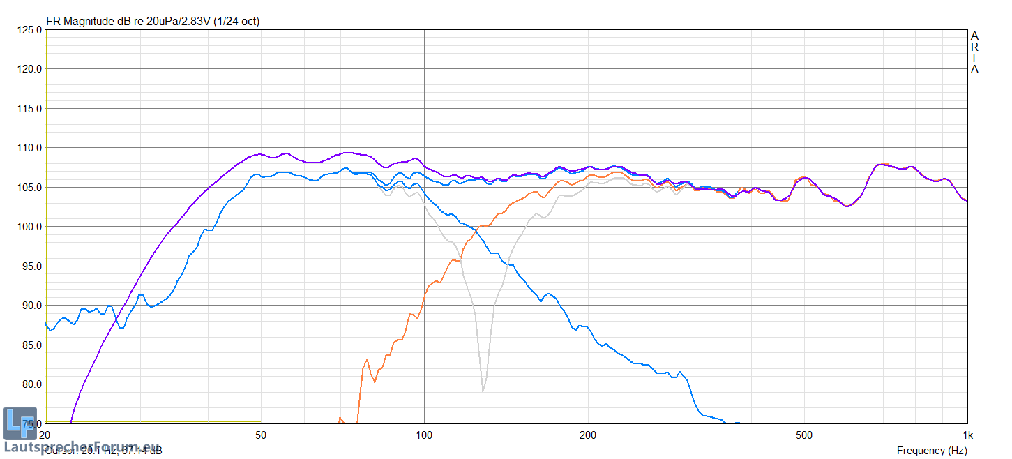 Setup ist komplett flat, so empfiehlt sich je nach Geschmack ein EQ auf alle Eingänge zu legen (A/B/Sum), in diesem Fall gefiel +9db @100Hz LP 12db/okt ganz gut.