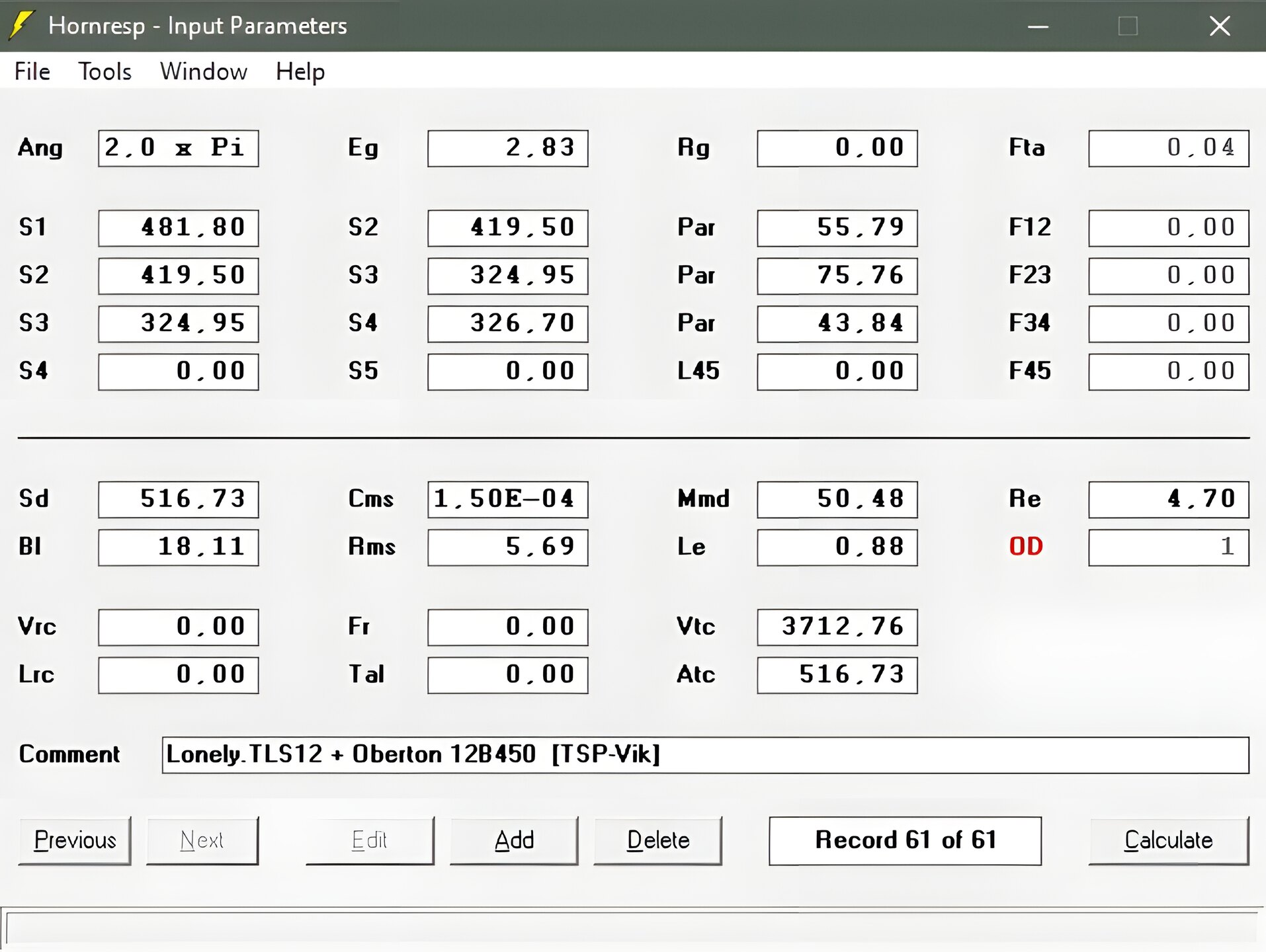 Eingabemaske mit den selbstgemessenen TSP vom Oberton 12B450