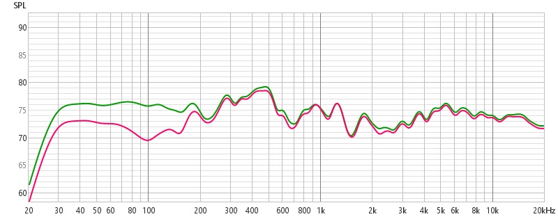 Wie man unschwer erkennen kann, sind die beiden Messungen in Grün und Gelb oberhalb unserer lilanen Referenz. Der Bass wird angehoben.