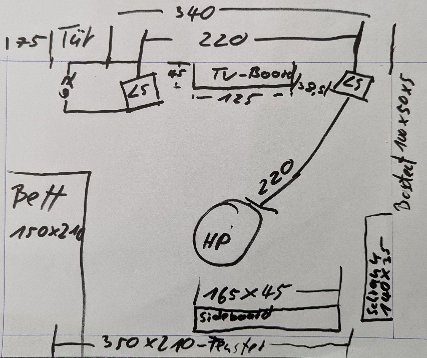 Aber dann vermutlich woanders? Ansonsten ist das die erste Position für Subwoofer 1, die zweite in der rechten Ecke.