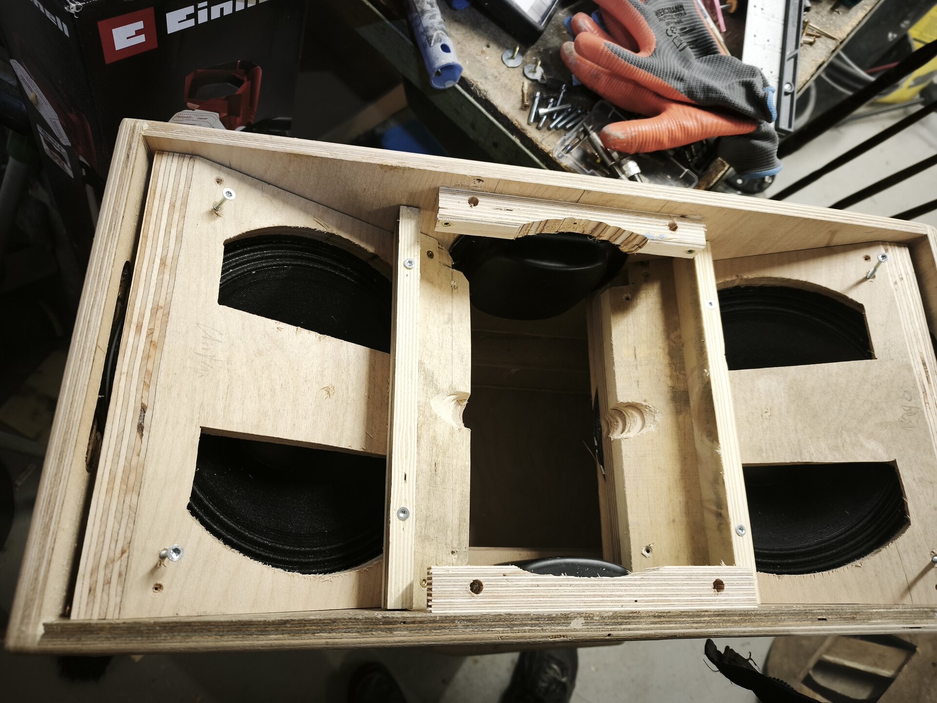 Sowas hatte ich mir schon gedacht, ich hatte ein Foto von einem A3 Leergehäuse gesehen, da war der Treiber vom Horn auch quasi im Gehäuse versenkt. Deswegen hatte ich beim zweiten Prototypen die 10" auch schon flacher angewinkelt, da zwei Rechteckports aber einfacher zu berechnen sind als ein runder, in dem der Treiber steckt, habe ich das dann so gebaut. Ggü dem ersten Prototypen ist der Einbruch aber nur ca. 100Hz hochgewandert. Ich habe übrigens den Hornflansch auch schon "abgedreht" damit er reinpasst: