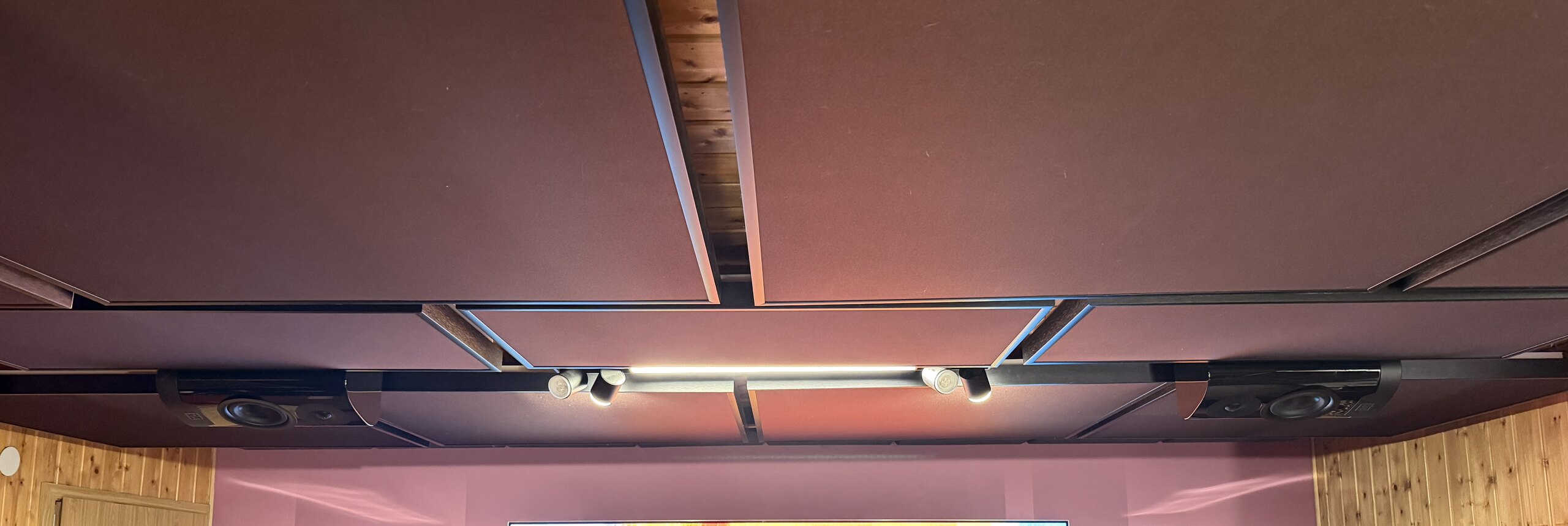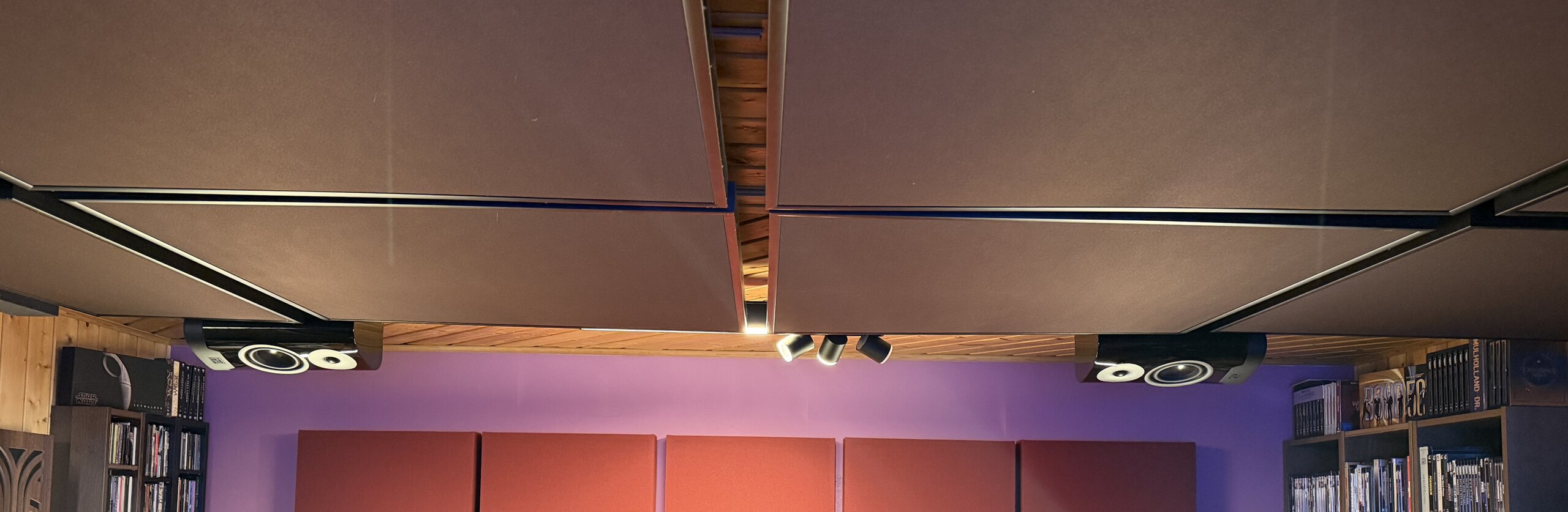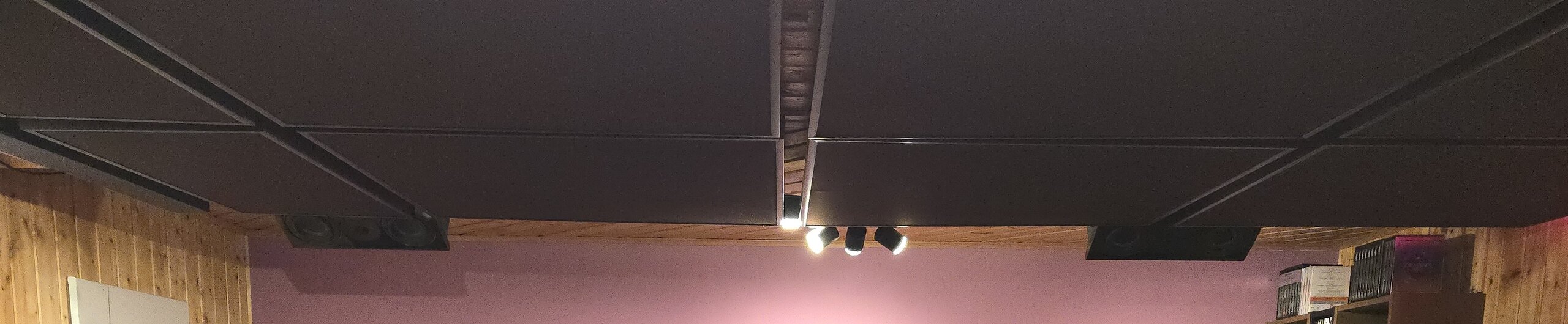 An der Zimmerdecke befestigt fällt auf: sieht weniger auffällig aus als befürchtet. Ohne die Deckensegel wären das aber wohl ganz schöne Klötze.