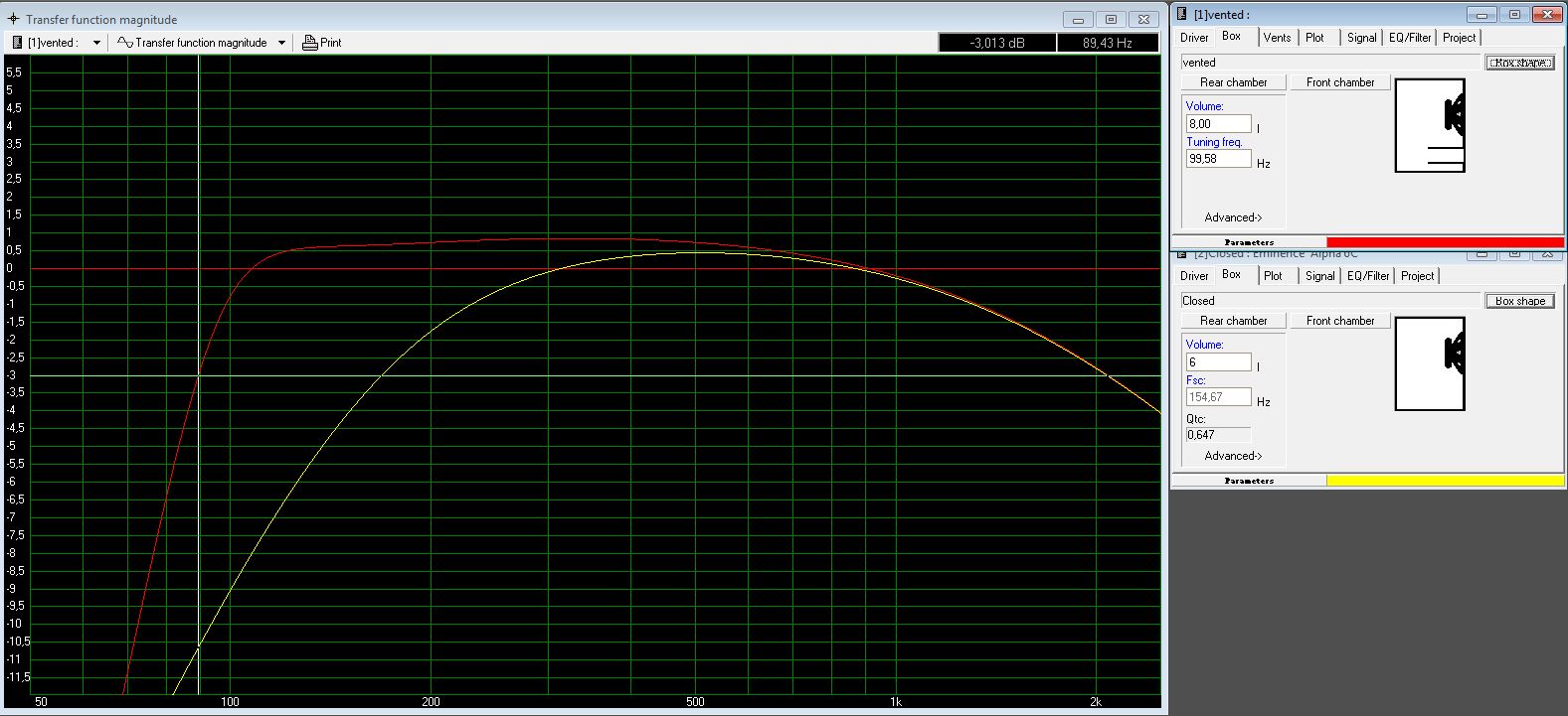 Ich habe gerade den Eminenc Alpha 6C noch einmal Simuliert, dabei hat das geschlossene 6Liter Gehäuse ein Qtc von 0,647, das geschlossene 8Liter Gehäuse 0,608.