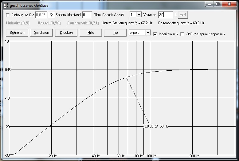 Hier das gleiche Chassis in 20l - ergibt ein Qtc von 0,64
