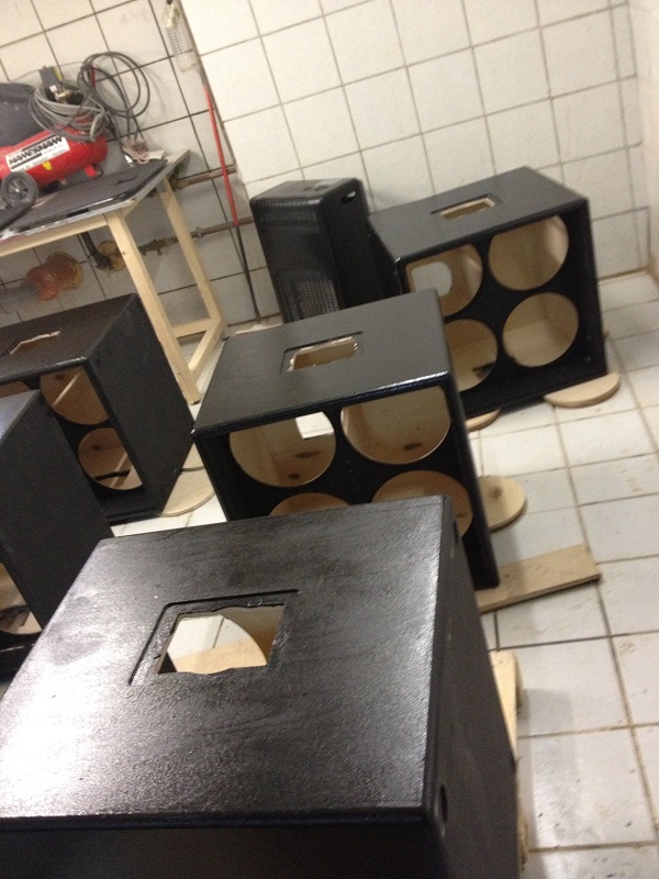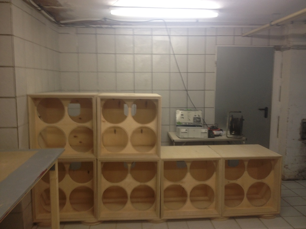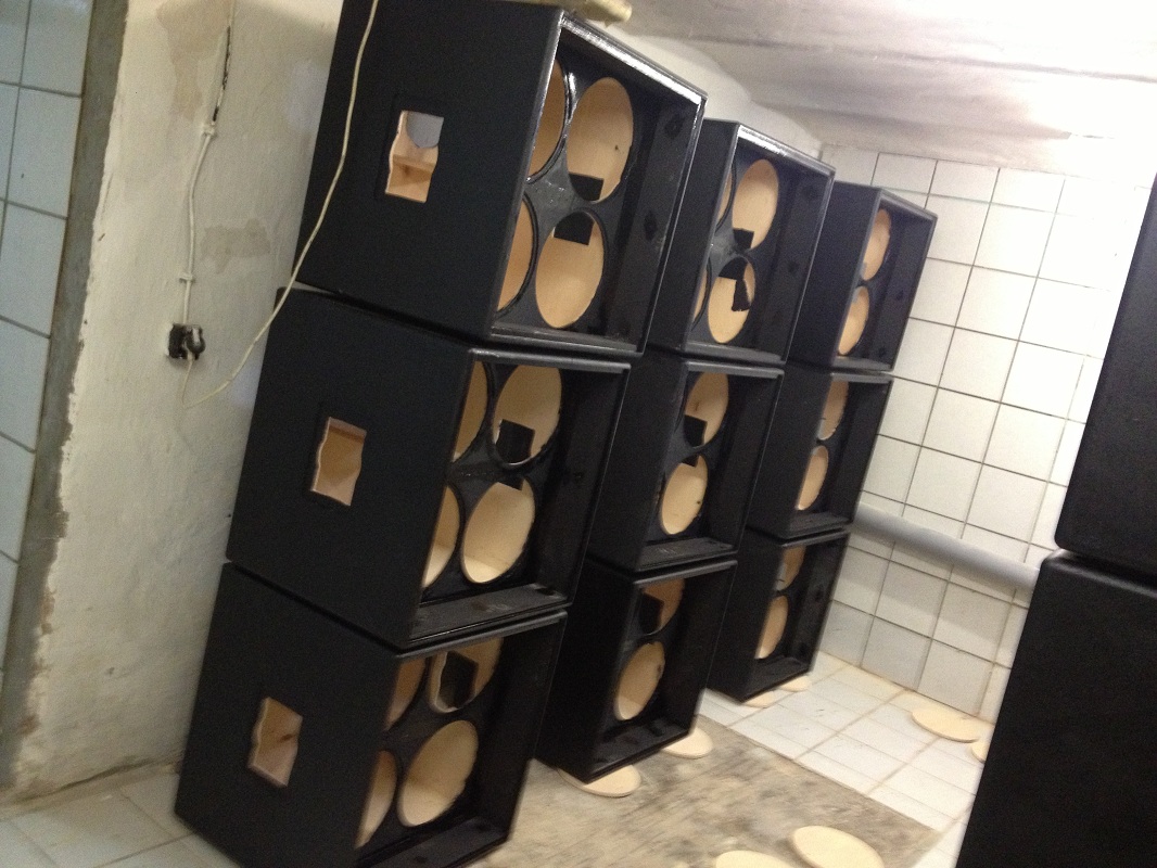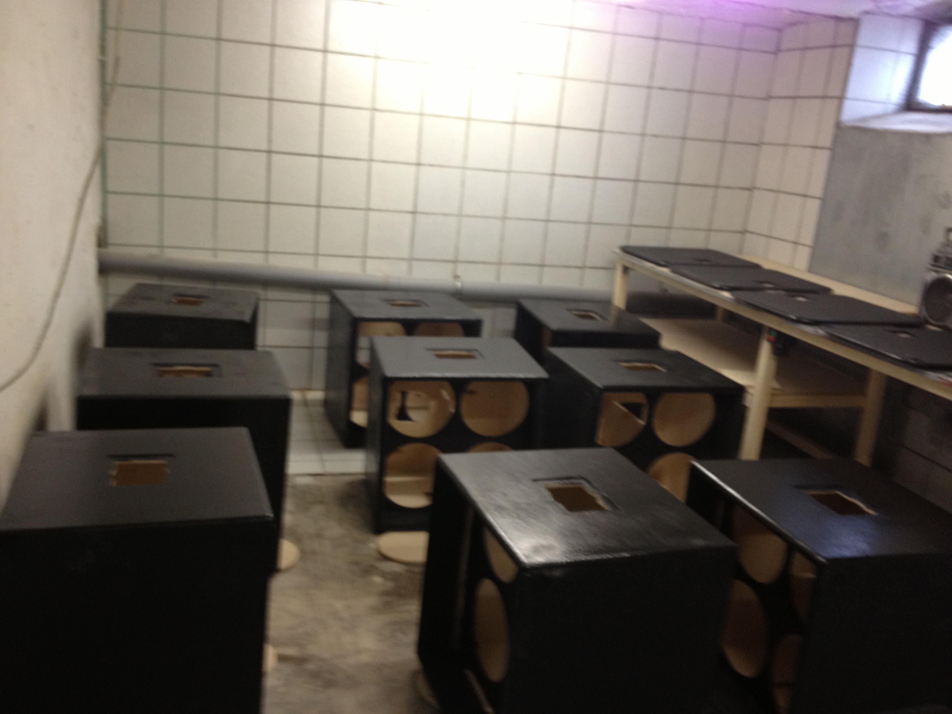 Platten Zugeschnitten: Die ersten Schallwände gefräst: Gehäuse zusammengespaxt: Ausschnitt fürs Anschlussfeld: Auschnitt für die Griffe: Versteifungen: Schablone für Fußfräsungen auf dem Frästisch erstellen: Fußfräsungen: Alte Schablone für Butterflys defekt, also kurzerhand eine von einem fertigen Rollbrett erstellt: Rollbrett mit Fuß und Butterflyfräsungen: Beim Rollbrett werden die Ecken rund: Kanten abgerundet, Löcher gebohrt: Versteifungen zugeschnitten: Blick in die Box: Kanten bündig fräsen und Kanten abrunden: Geschliffen, Schrauben entfernt, Holzdübel eingeleimt: Gespachtelt und geschliffen: Gitter angekommen und gleich mal probiert: Subs mit Versteifung und Schallwand: Subs mit Griff und Fußfräsungen: Subs mit Mittelversteifung: Bereit zum Lackieren: Frisch lackiert - Voranstrich - Part 1: Frisch lackiert - Voranstrich - Part 2: Frisch lackiert - Voranstrich - Part 3: Frisch lackiert - Deckanstrich - Part 1: Frisch lackiert - Deckanstrich - Part 2: Frisch lackiert - Deckanstrich - Part 3: 12" Treiber, Z = 8Ohm, R = 6,06Ohm (gemessen 5,9Ohm): Oben Anschlussfelder, links Chassisverkablung, rechts Innenverkablung Anschlussfeld links Innenverkablung Anschlussfeld, rechts Chassisverkablung Anschlussfeld mit Verkablung 1+- Subbass, 2+-Top durchgeschliffen: Rollbretter mit Einschlagösen: Fertige Rollbretter: Speaker montiert und verkabelt: Auflage fürs Gitter: Verbindung zur Außenwelt: Fertige Subwoofer: Ein Stack - 130x260x58 (B x H x T): to be continue....