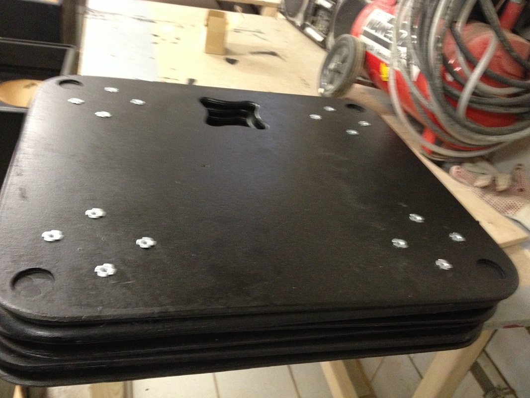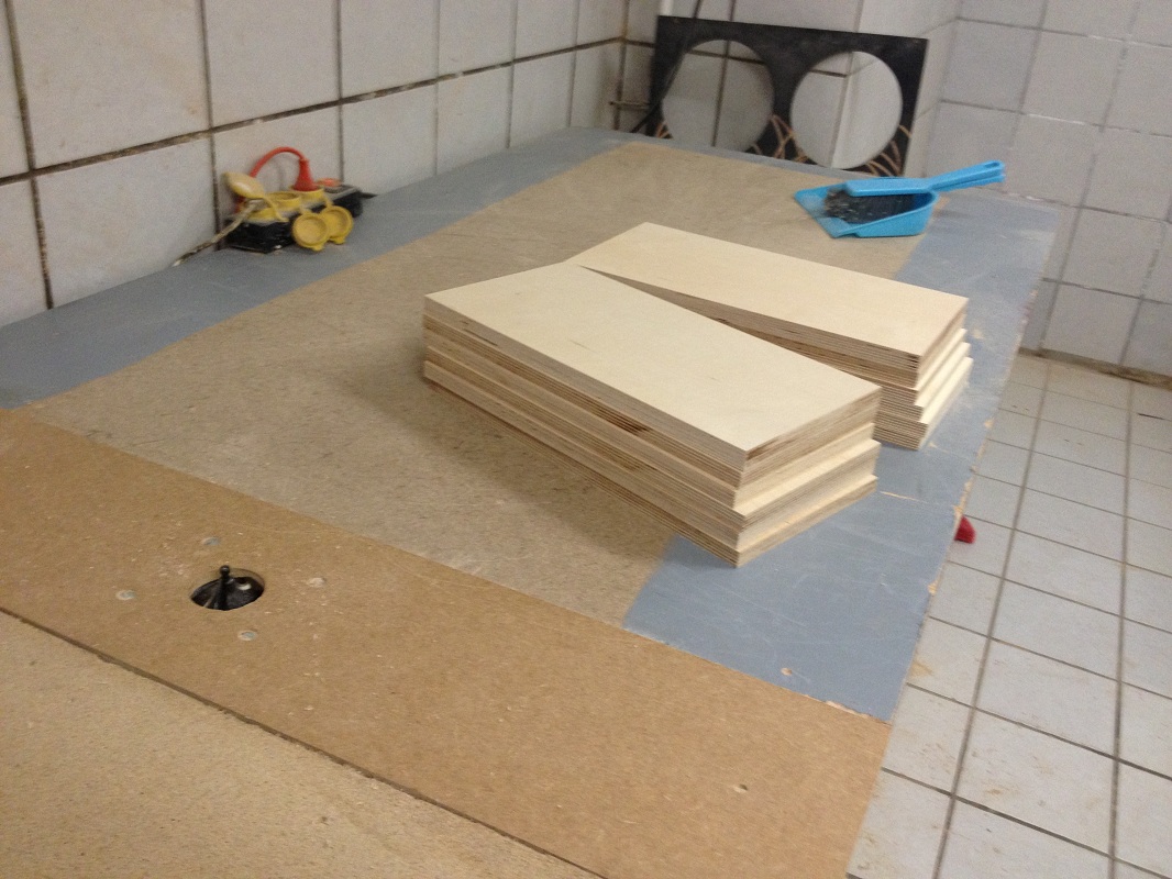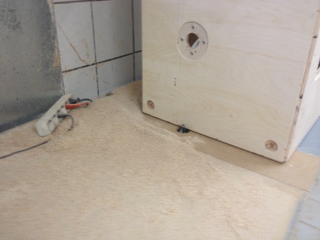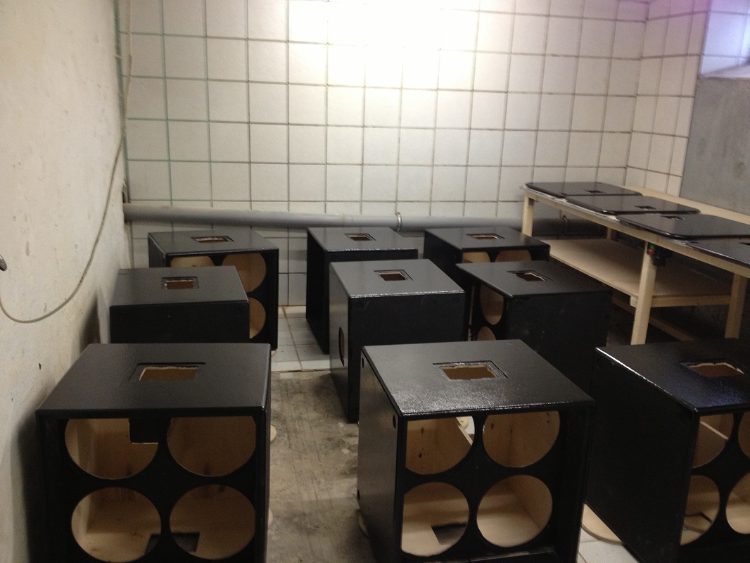 Platten Zugeschnitten: Die ersten Schallwände gefräst: Gehäuse zusammengespaxt: Ausschnitt fürs Anschlussfeld: Auschnitt für die Griffe: Versteifungen: Schablone für Fußfräsungen auf dem Frästisch erstellen: Fußfräsungen: Alte Schablone für Butterflys defekt, also kurzerhand eine von einem fertigen Rollbrett erstellt: Rollbrett mit Fuß und Butterflyfräsungen: Beim Rollbrett werden die Ecken rund: Kanten abgerundet, Löcher gebohrt: Versteifungen zugeschnitten: Blick in die Box: Kanten bündig fräsen und Kanten abrunden: Geschliffen, Schrauben entfernt, Holzdübel eingeleimt: Gespachtelt und geschliffen: Gitter angekommen und gleich mal probiert: Subs mit Versteifung und Schallwand: Subs mit Griff und Fußfräsungen: Subs mit Mittelversteifung: Bereit zum Lackieren: Frisch lackiert - Voranstrich - Part 1: Frisch lackiert - Voranstrich - Part 2: Frisch lackiert - Voranstrich - Part 3: Frisch lackiert - Deckanstrich - Part 1: Frisch lackiert - Deckanstrich - Part 2: Frisch lackiert - Deckanstrich - Part 3: 12" Treiber, Z = 8Ohm, R = 6,06Ohm (gemessen 5,9Ohm): Oben Anschlussfelder, links Chassisverkablung, rechts Innenverkablung Anschlussfeld links Innenverkablung Anschlussfeld, rechts Chassisverkablung Anschlussfeld mit Verkablung 1+- Subbass, 2+-Top durchgeschliffen: Rollbretter mit Einschlagösen: Fertige Rollbretter: Speaker montiert und verkabelt: Auflage fürs Gitter: Verbindung zur Außenwelt: Fertige Subwoofer: Ein Stack - 130x260x58 (B x H x T): to be continue....