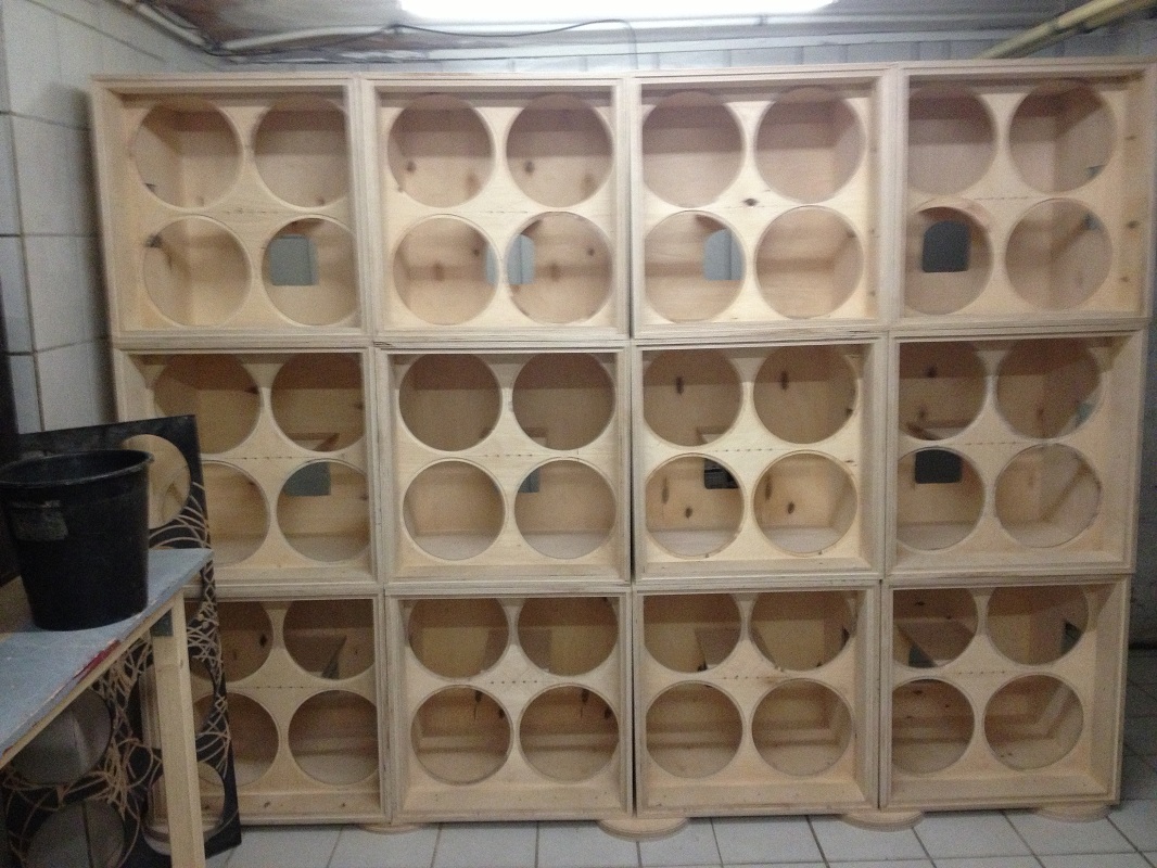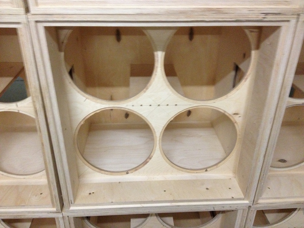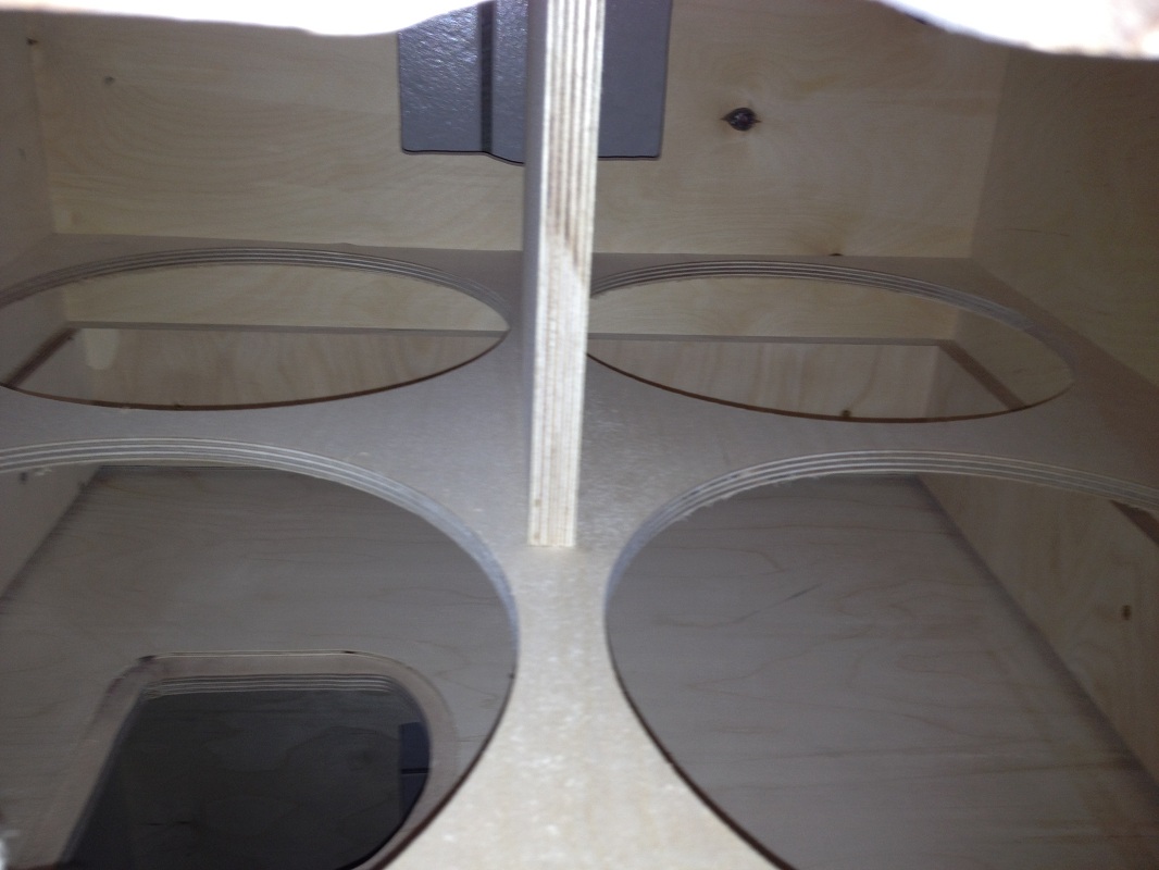 Die Chassis sind selbstverständlich eingelassen, ich montier sie wegen der Kühlung wieder falschrum. Verstrebt sind die Boxen, eine mittlere 20cm breite Strebe muss ich noch nachträglich reinsetzen, die wurde beim Zuschnitt vergessen. Kann man aber durch die Chassisöffnung noch anbringen. Die 12er arbeiten wie schon erwartet auf eine gemeinsame Kammer. Im Vergleich zu den 10ern erwarte ich mir rein garnichts, es ist einfach anders, ob man jetz 32 10er oder 24 12er einsetzt, man wird keinen extremen Unterschied merken. Die Subs hätte man auch auf 606080 bringen können, aber hat für mich keinen Vorteil und bei max. 24 Kisten muss man auch nich soo aufs komplette Truckmaß achten. 58cm hast dein Truckmaß ^^