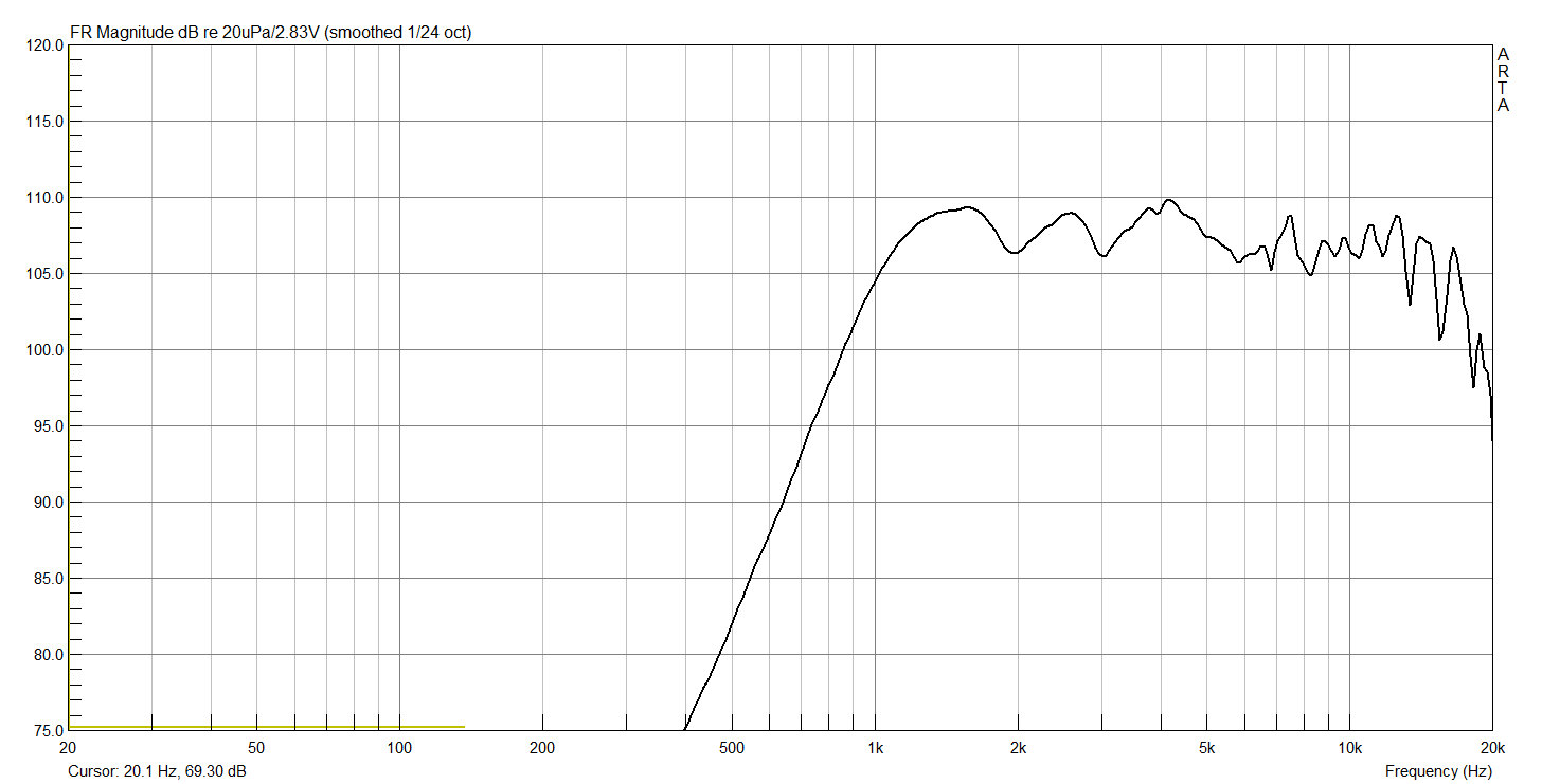 Das war die Messung HF100 am STH100 unkalibriert mit 4ms Gate und 60cm Messabstand im Wohnraum mit Teppich ausgelegt. Die Delle bei über 10khz ist Treiberbedingt. Hatte noch kein Horn, was wirklich dort Besserung verschaffte.