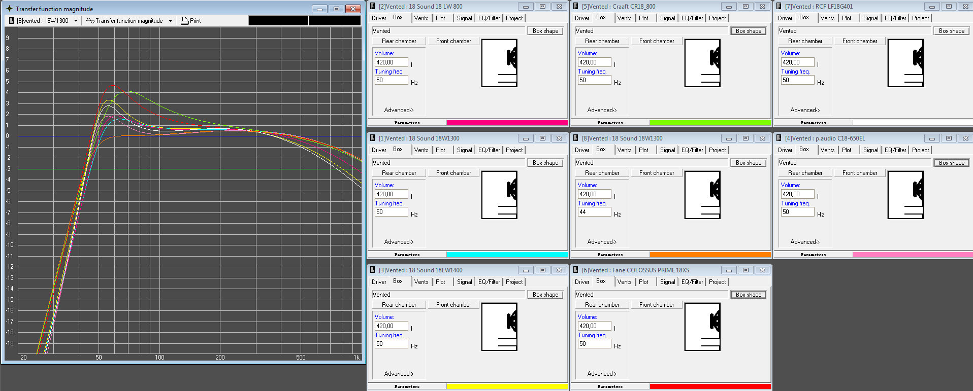 Orange: W1300 tiefer getuned, wobei 42-43Hz klanglich noch interessanter wäre.