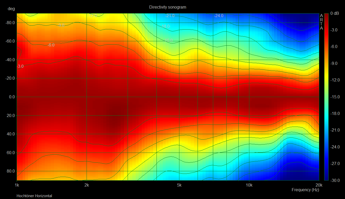 Die Bündelung dürfte durch das kleine Horn bedingt relativ verhalten sein - eine höhere Trennung hätte hier aber nicht geholfen, da auch die TT erst ab 3khz horizontal unter 100° zusammenziehen.