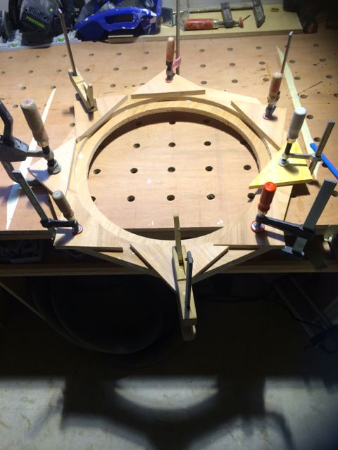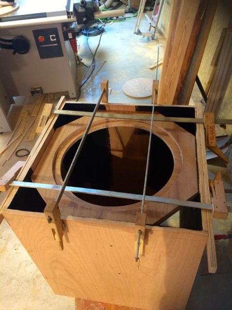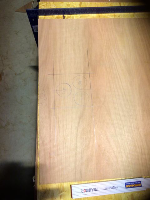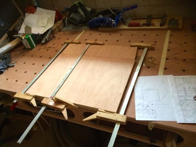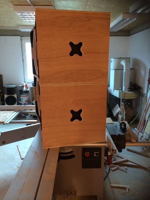 Habe mich für hinten, in der oberen hälfte entschieden. 3 stück--In-Out und einmal für die Tops. Fix eine Schablone zu fräsen gebaut und verleimt Direkt nach dem Zusammenbau der Gehäuse habe ich alle Ecken die später durch den Reflextunnel zu sehen sein könnten mit Warnex gerollt und anschliessend als der Lack trocken war die aufgedoppelten Fronten eingeleimt und verspannt und geklammert.