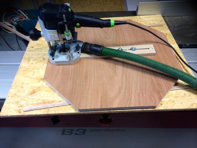 Oberfräse, Eigenbau Fräszirkel und das fräsen ist im nu passiert. Nach dem fräsen schnell die Fronten verleimt, gepresst und zusätzlich noch geklammert, denke das sollte halten