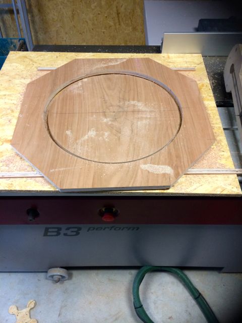Oberfräse, Eigenbau Fräszirkel und das fräsen ist im nu passiert. Nach dem fräsen schnell die Fronten verleimt, gepresst und zusätzlich noch geklammert, denke das sollte halten