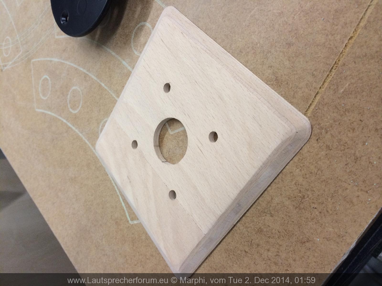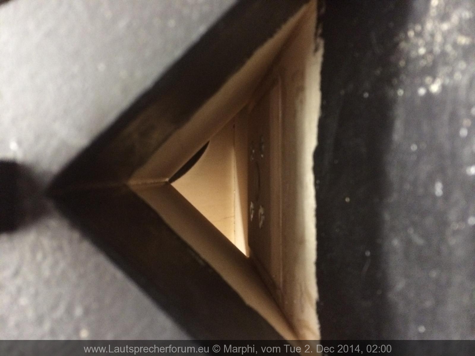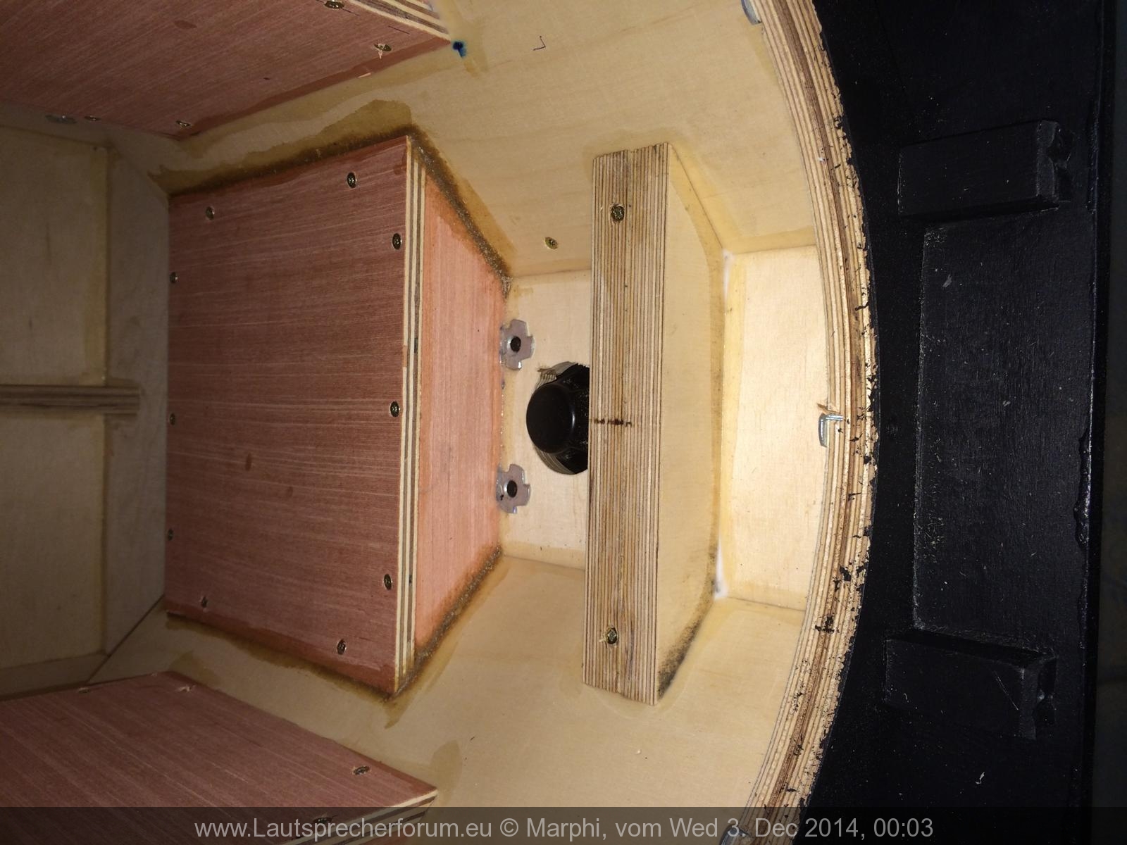 Noch eine Frage. Wo habt ihr eigentlich die Frequenzweiche untergebracht. Die ist ja doch ganz schön groß. Es wäre ja gut, wenn Diese irgendwo mittig sitzt, damit der Lautsprecher nicht links- oder rechtslastig wird. Am Boden ist der Flansch. Also ist da auc wenig Platz. Bleibt noch der Deckel...