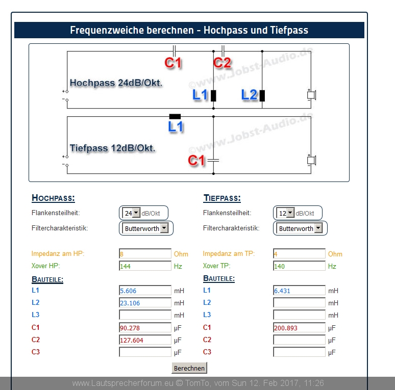 Eine passive Trennung im Bassbereich ist alles andere als trivial und mit standardmäßig berechneten Filtern nicht zu machen. Die Impedanz ändert sich um die Resonanzfrequenz stark über der Frequenz, was sich wiederum auf die Übertragungsfunktion des Filters auswirkt. Das lässt sich auch mit Simulationstools wie Boxsim leicht nachvollziehen.