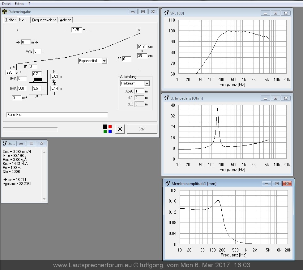 15cm Hornhalsdurchmesser läd bis 1,1kHz WENN die Öffnung Rund wäre ... ist sie aber hier nicht beim gezeigten *Simplexhorn* sondern Quadratisch ... "Vorkammer" auch noch ... also wenn das gescheit Funktionieren soll mit Ladung besorge schon mal nen BMS Koax mit Horn oder dicken 1,4"er oder so.