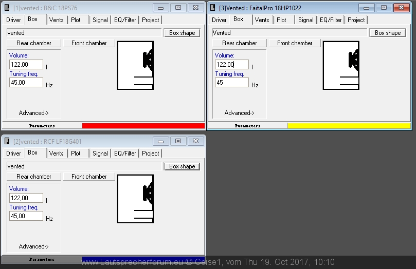 Gehäuseeinstellungen: 122l (lt. Jobst), Tuningfrequ: 45 Hz. Ports: 4 Stück rechteckig 10,6cm x 10,6cm --> das entspricht 4 mal dreieckig 15cm x 15cm