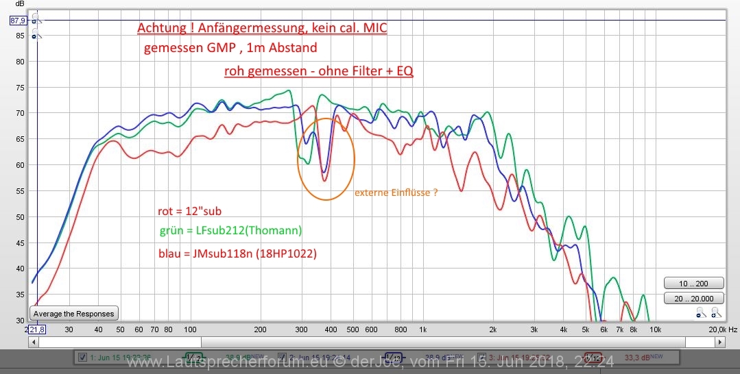 Das Mikrofon habe ich in 1m Abstand auf dem Boden positioniert. Zum Vergleich, und um evtl. Messfehler oder Einflüsse von außen zumindest zu erkennen, habe ich noch eine LFsub212 mit Thomann Bestückung und eine JMsub18N mit Faital 18HP1022 zum Vergleich gemessen.