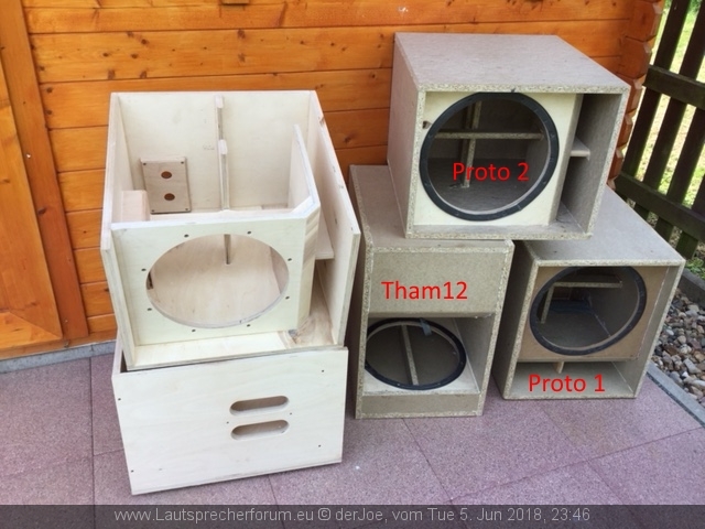 Nachdem ich mich ein wenig mit WinISD beschäftigt hatte begann ich , einen BR-Prototypen zu bauen. Gleichzeitig baute ich zum Vergleich auch ein Tham12 Gehäuse. Unser Forumsmitglied CRIWO hatte so eine Tham12 mit potentem Chassis (18sound?) auf dem letzten Forums treffen dabei. Das Ding hatte mich schon irgendwie angesprochen.