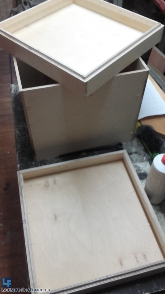 Es wurde Samstag schnell mal noch ein Protogehäuse mit versetzbarer Rückwand gebaut, um verschiedene Volumina auszuprobieren. Testvolumina waren etwa 63, 58, 50, 40, 36, 32, 28 Liter.
