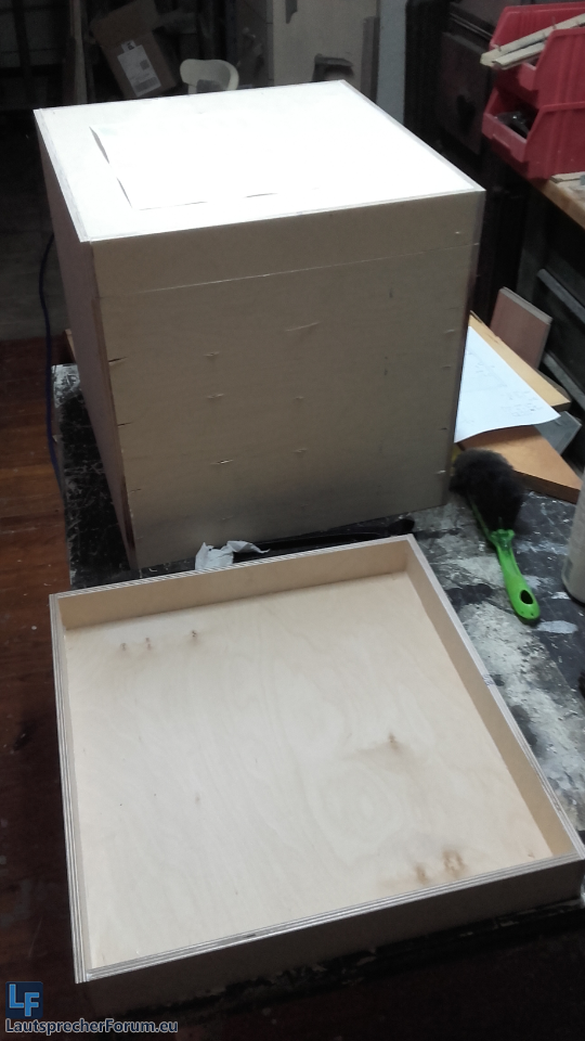 Es wurde Samstag schnell mal noch ein Protogehäuse mit versetzbarer Rückwand gebaut, um verschiedene Volumina auszuprobieren. Testvolumina waren etwa 63, 58, 50, 40, 36, 32, 28 Liter.