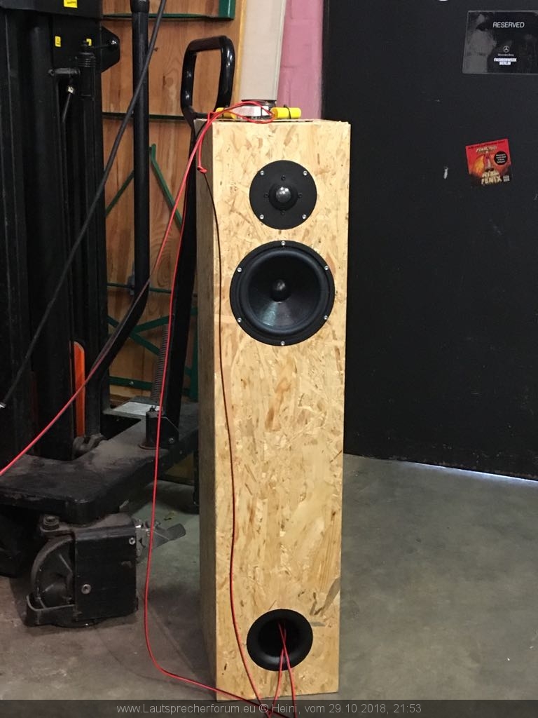 Edit: Höreindruck... Am besten selbst anhören, finde die Kiste ist echt gut geworden. Hab hohe Ansprüche an solche Lautsprecher und werde mir vermutlich auch zwei bauen. Für alle, die die üblichen Sprüche aus diversen Fachzeitschriften jetzt lesen möchten: Tiefbass wie eine Rüttelplatte, Kick wie ein Pferdetritt aufs Brustbein, sanfte Mitten wie von einem Engel geküsst und Höhen, die so Kristallklar und voller Feenstaub sind!