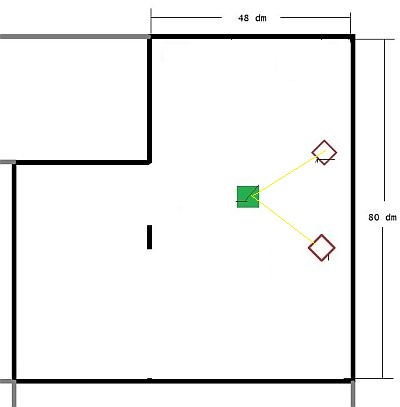 Setting Abstände 4 m Wand, 1.2 m zu Seiten, stereo 3-eck: 240 x 160 x 160 cm, 5° auf Achse.