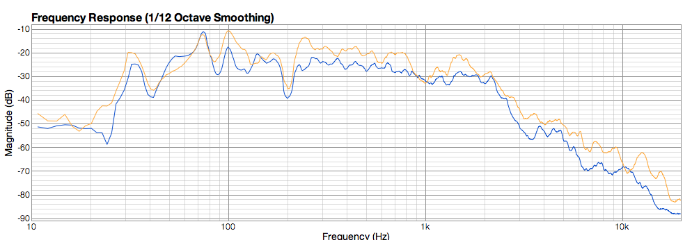 Orange: W1300 tiefer getuned, wobei 42-43Hz klanglich noch interessanter wäre. Hier nochma mit etwas Erwärmung der VC und dem W1300 auf 42hz anstatt 44Hz,