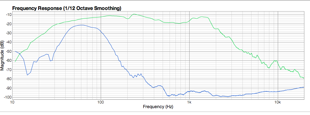 hier nochmal eine messung der 18-500 mit angepasstem port (5cm --> 48hz tuning): (grün ohne cuts und blau mit hi und lo-cut über den dcx)