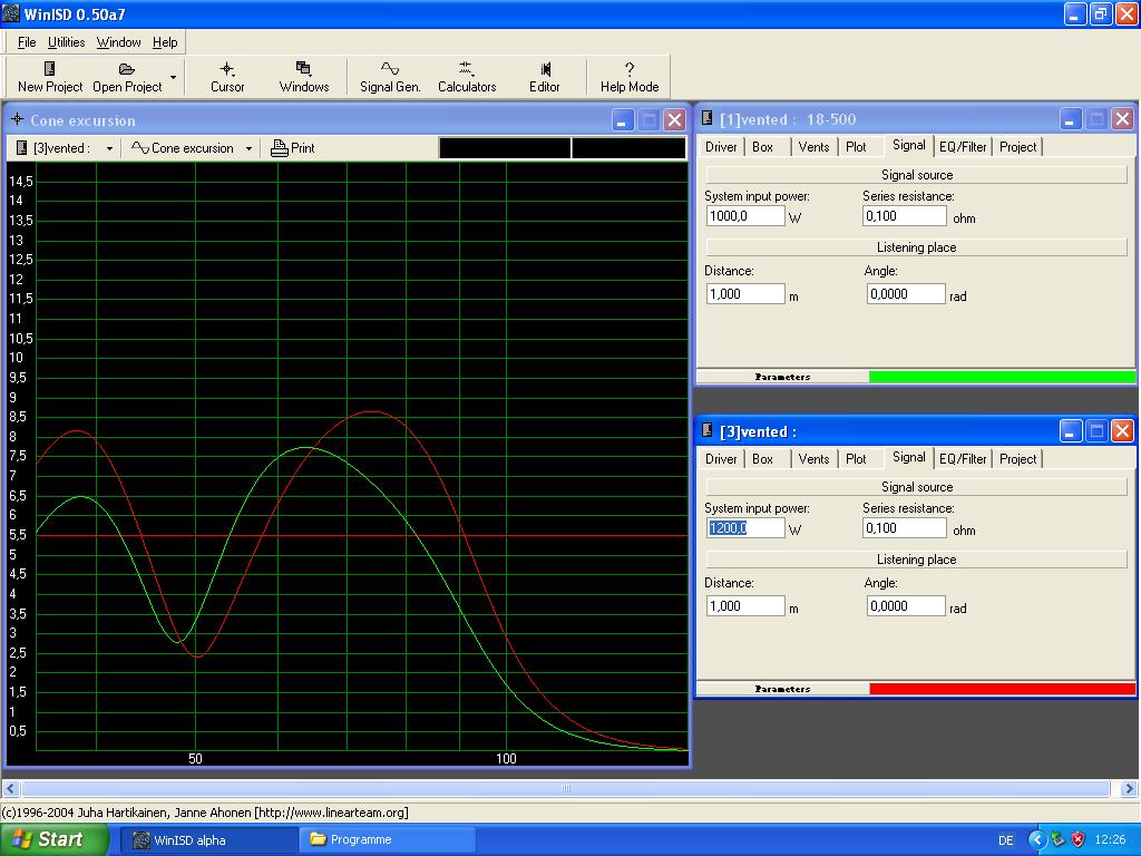 was den Buckel noch bissel flacher macht, dafür minimal weniger max Pegel. Noch ne Simulation, jeweils bis Xmax (Alle berechnet mit +HG/4), jeweils die zugeführten Leistungen beachten,