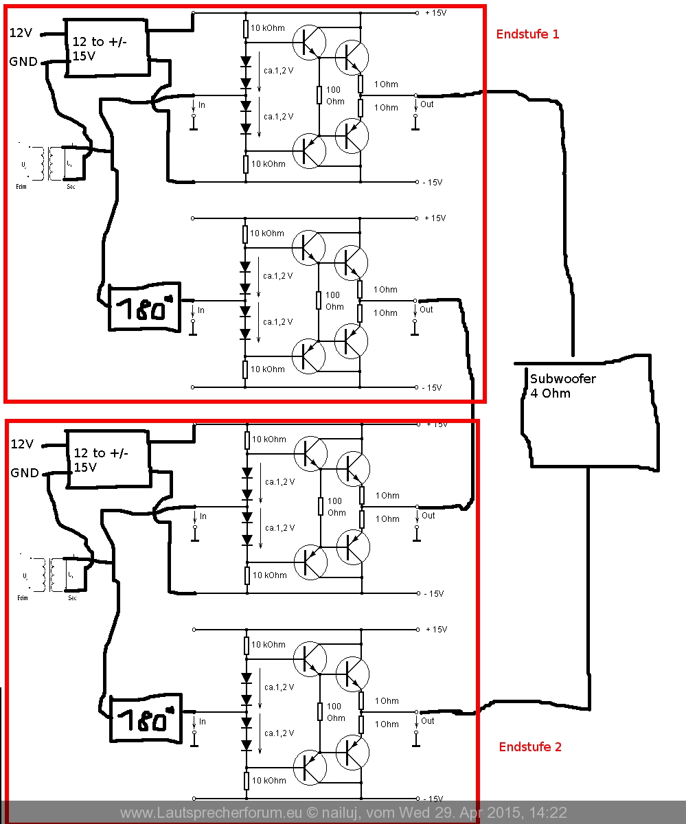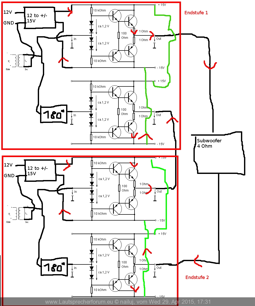 Leider haben die meisten Endstufen mehr als einen Kanal(Bei mir 2). Diese teilen sich die Railspannung, das hab ich in meinem Bild als bekannt vorausgesetzt. Bei Endstufe 1 sind also die +15V von Kanal 1 die gleichen +15V wie bei Kanal 2. Dann ist der Stromkreis auch geschlossen, oder sehe ich das falsch?