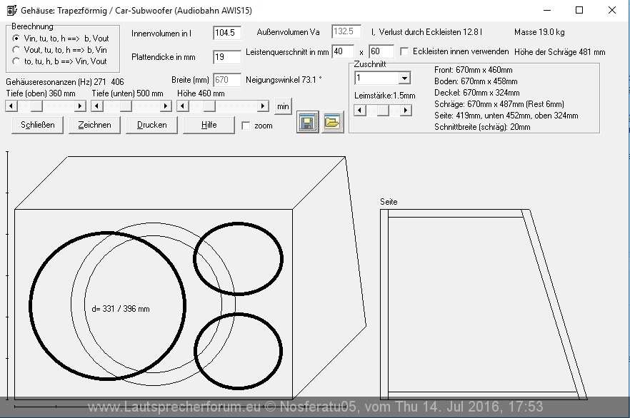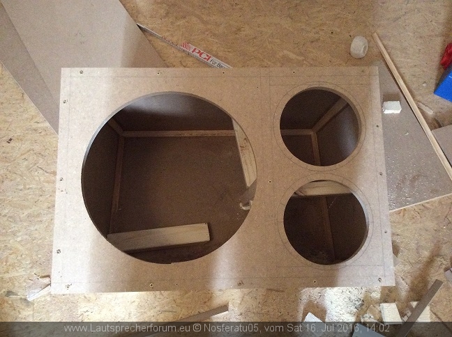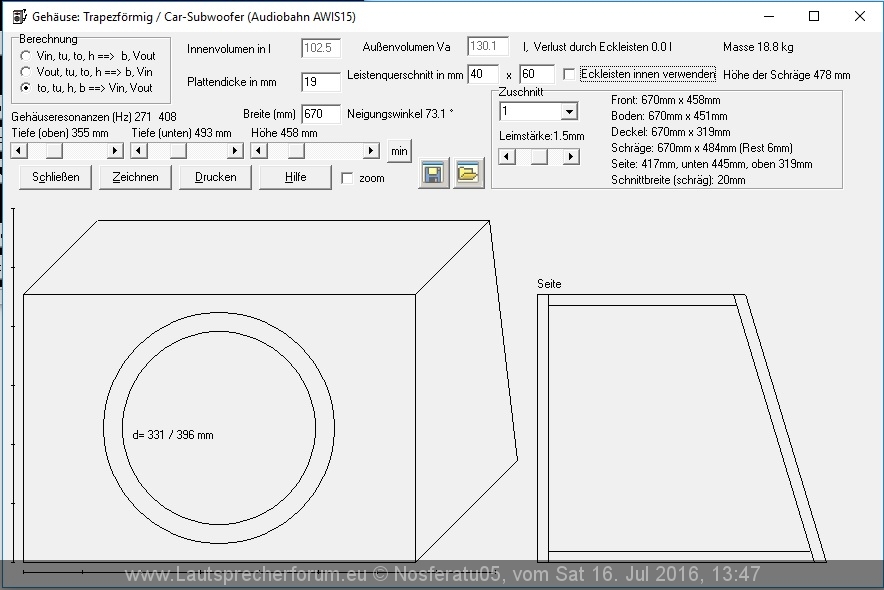 Bezüglich Plattenstärke der grossen Kiste. Soll ich da auf 16 mm gehen und verstreben? Auf einen Meter länge würde uch das auch mit 19 mm machen, daher die Frage. Ist billiger und macht die Kiste 5 Kilo leichter. Wobei dann aber das Volumen der Streben noch in das Volumen rein gerechnet werden müsste :/
