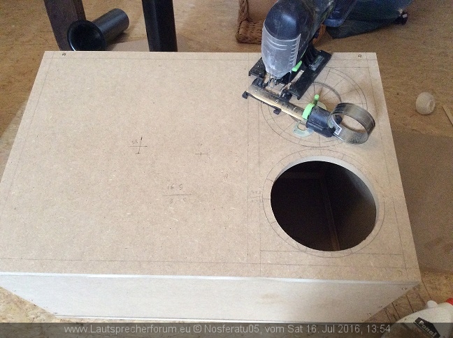 Wenn der Port irgendwo unterhalb hin kann, sollte er genug Platz nach hinten haben. Auch das werde ich morgen noch mal probieren. Ich muss ja die Stärke vom Holz wieder abziehen. Wird ne knappe Nummer mit 22 cm oben, so denke ich.