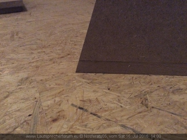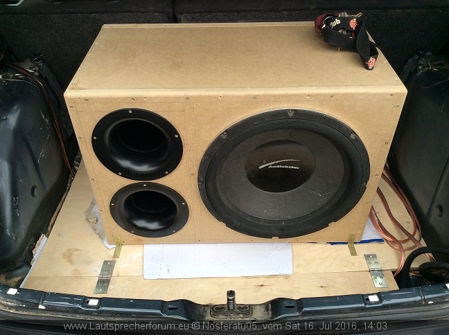 Jedoch ist der Kofferraum mit einer dünnen MPX Platte ausgelegt und da steht der Woofer drauf. Je nach Frequenz knattert es jetzt da hinten extrem.