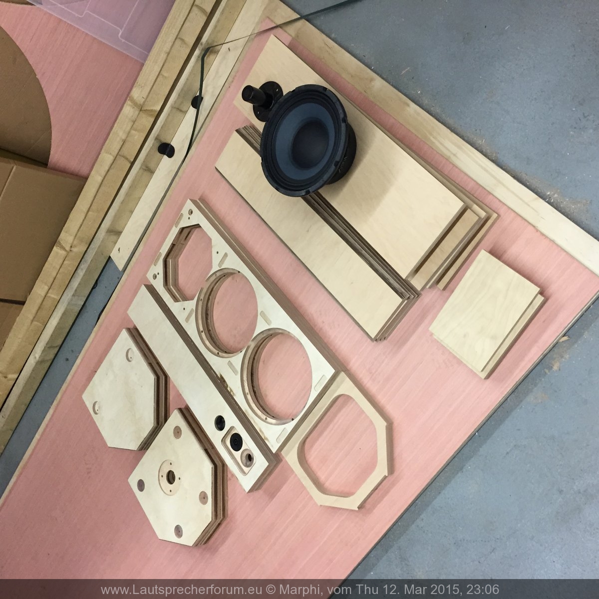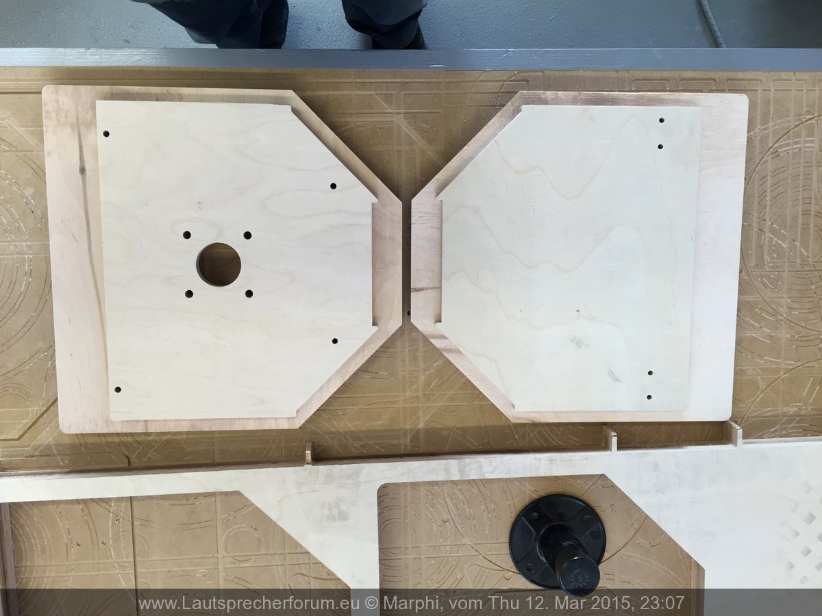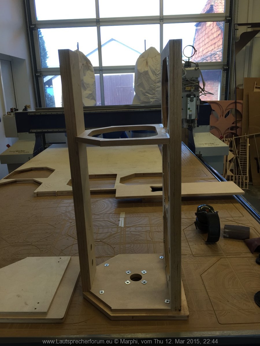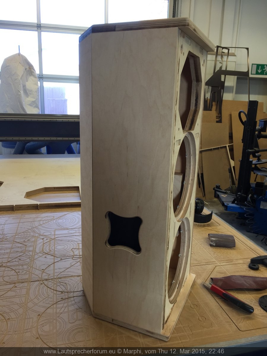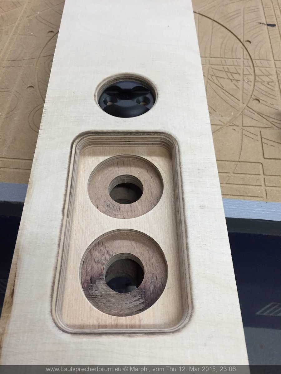 Das hat dazu geführt, dass das Top die Tendenz hatte "in den Himmel zu strahlen". Da zusätzlich aber auch der Stativflansch mit dem unteren Tieftöner kollidierte habe ich den Flansch 2,5cm weiter nach hinten gesetzt und beide Probleme waren gelöst. Hat mich allerdings nochmal ein wenig Zeit an der CNC Fräse gekostet... na was soll's. Jetzt liegt der Flansch ziemlich genau im Schwerpunkt (gaaanz leichte Tendenz nach vorne zu kippen). Also "optimalst"!