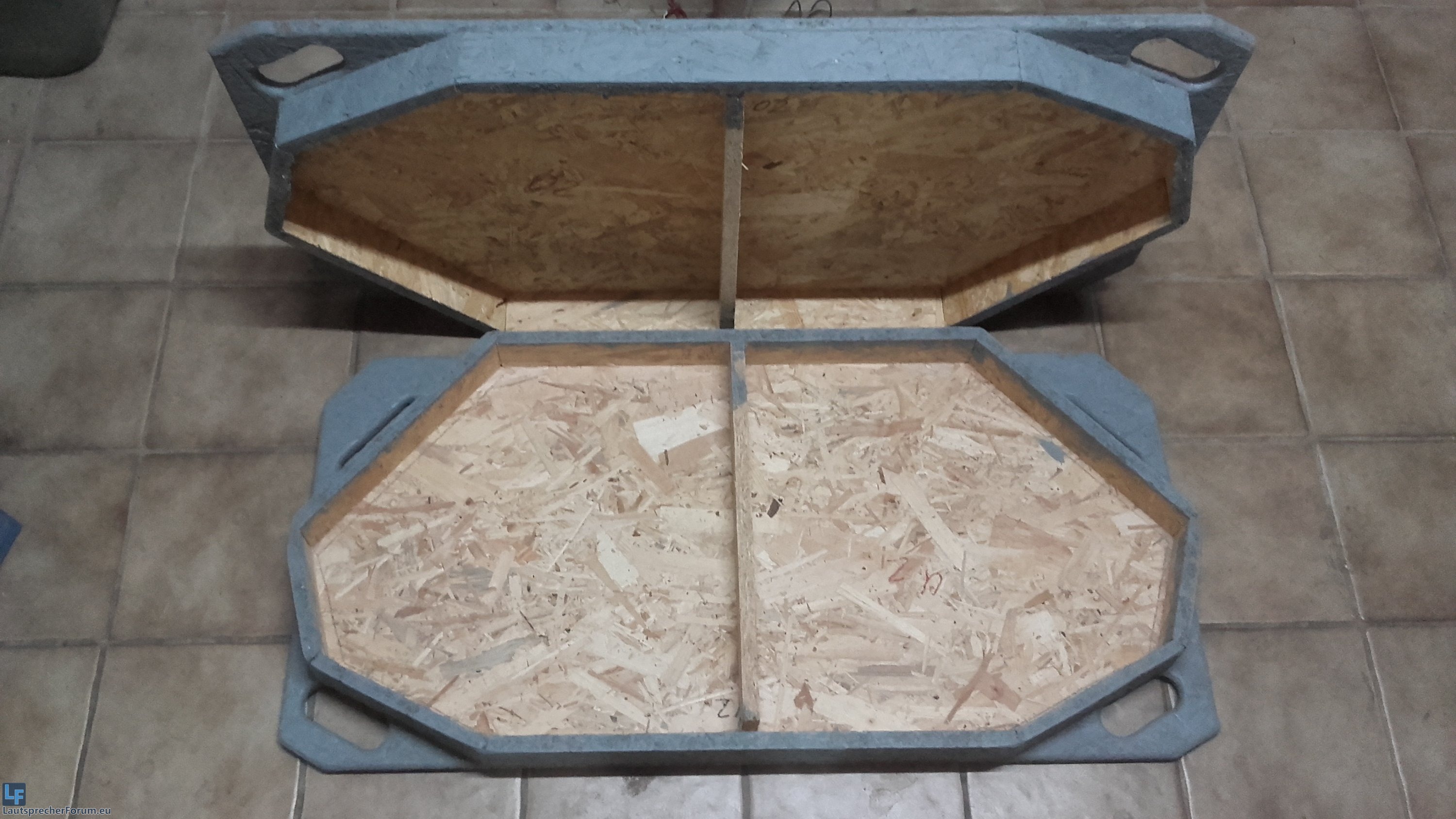 Ergebnis: Aus OSB gefertigte Platten, rundum etwas größer als die Stand/Deckelfläche, damit noch etwas Schaumstoff zwischen Box und umfassender Konturkante hinpasst. Alle Platten wurden etwas abgeschrägt und diese Ecken dann direkt für Griffausschnitte genutzt.