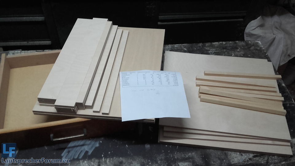 Es wurde Samstag schnell mal noch ein Protogehäuse mit versetzbarer Rückwand gebaut, um verschiedene Volumina auszuprobieren. Testvolumina waren etwa 63, 58, 50, 40, 36, 32, 28 Liter.
