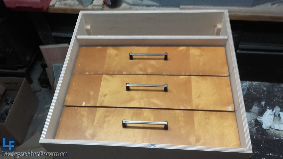 Auf dem Weg durch den Keller fiel dieser Tage mein Blick auf zwei im Regal liegende Schubladen. Diese beiden leeren und ein weiteres mit Notizen und Co gefülltes Exemplar waren mal irgendwie übrig geblieben, als eine Kommode entsorgt wurde. Damals noch mit Unterlagen gefüllt, hatten sie ab und an die Aufgabe von Sortierkisten. Fast 19 Zoll breit sollte sich doch was mit den Dingern anstellen lassen…