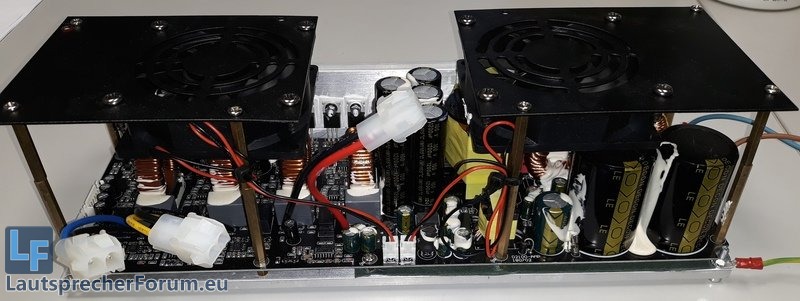 Bei dem ersten verbauten China Modul habe ich auf ausenliegende Kühlkörper verzichtet ( es war hat gerade nichts passendes da) und die lauten Originallüfter verquirlen die entstehende Wärme in der Box. Das wird dann außen im Betrieb ordentlich warm, deswegen habe ich beim aktuell verbauten jeweils einen Kühlkörper innen und außen drauf gepackt, ob es hilft wird sich irgendwann im nächsten Jahr mal zeigen. Leider war auf dem Bild von der Außenseite des China-Moduls der DSP gerade nicht eingebaut, von daher sieht man da wo die beiden XLR-Eingänge rechts neben dem Kühlkörper sein sollen nur Löcher in der Alu-Platte.