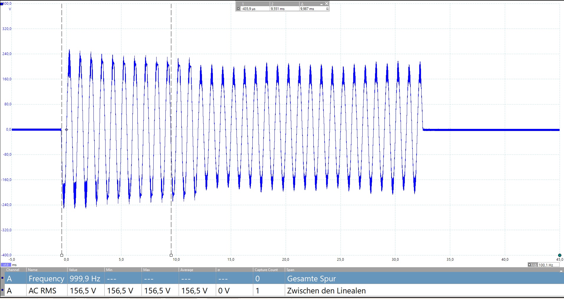 Schauen wir uns als erstes die Messung mit 1kHz, 33ms Burst (100ms Pause) an: Das sind in den ersten 10ms 156 Volt RMS - entsprechend einer Leistung von 6084 Watt! Wertet man den durchschnittlichen AC Mittelwert auf die komplette 33ms Signalimpulsdauer aus, erhalten wir 136 Volt RMS = 4624 Watt. Also, Dynamik und Power hat das Teil enorm!