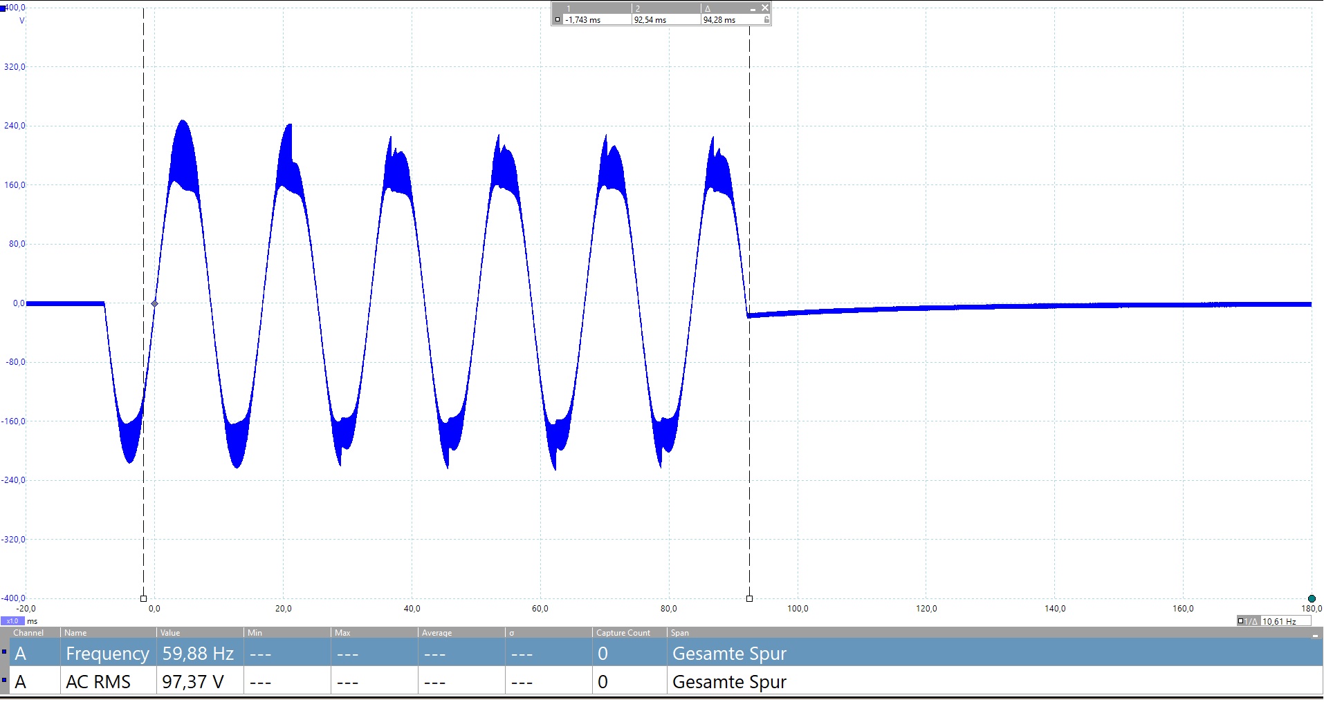 Messungen bei 1kHz können fast alle Endstufen gut. Mit Burst sogar sehr gut. Erst bei tieferen Frequenzen zeigen sich realere Leistungen. Wir testen mit 60Hz, Impulsdauer ist 100ms: Aha, die Leistung bricht erwartungsgemäß ein. Die Messung des 100ms Abschnitts bringt uns aber immerhin noch knapp 98V RMS, was beachtliche 2401 Watt an 4 Ohm sind.