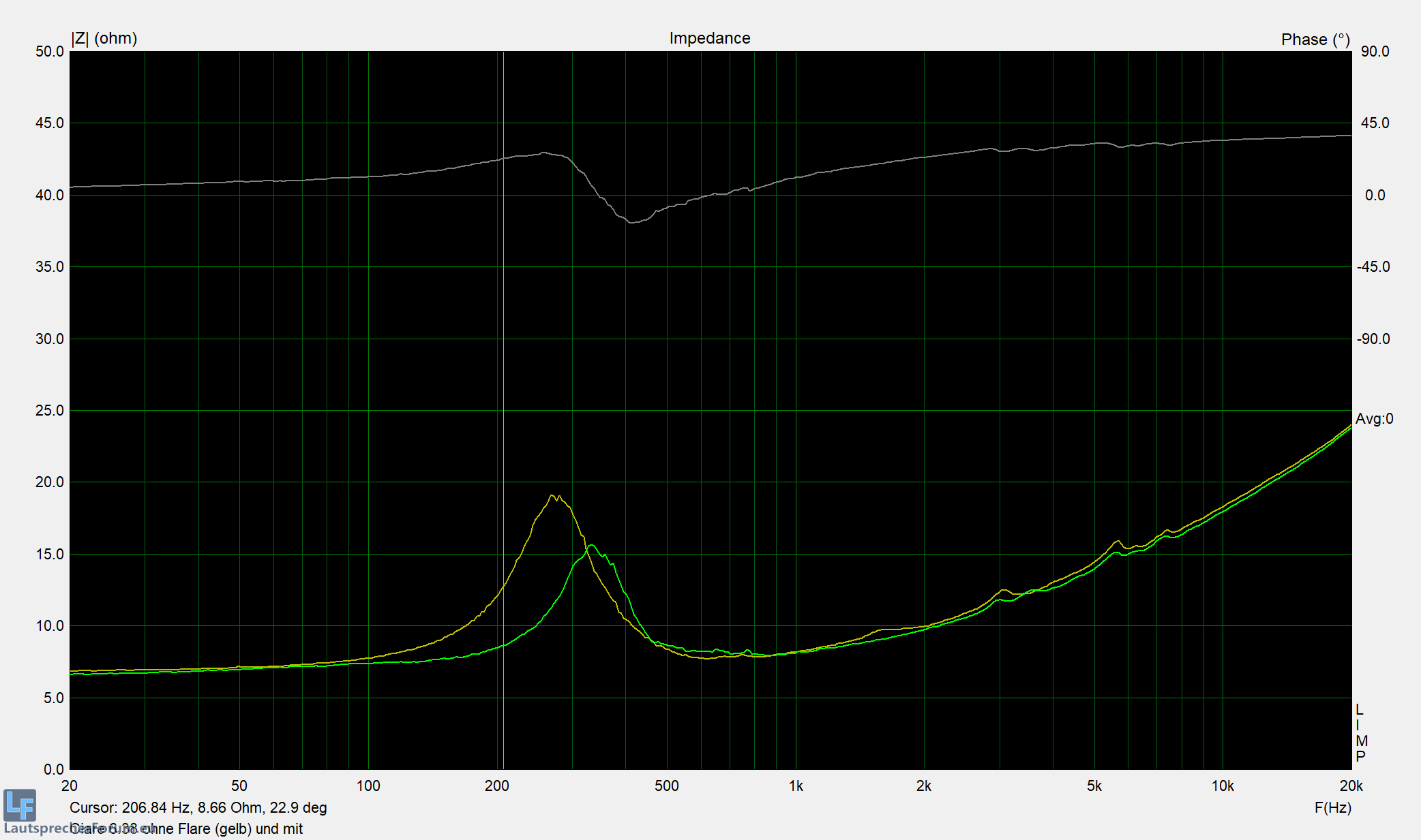 Impedanz des Ciare im Vergleich free-air zu Flare + bedämpftem Gehäuse.