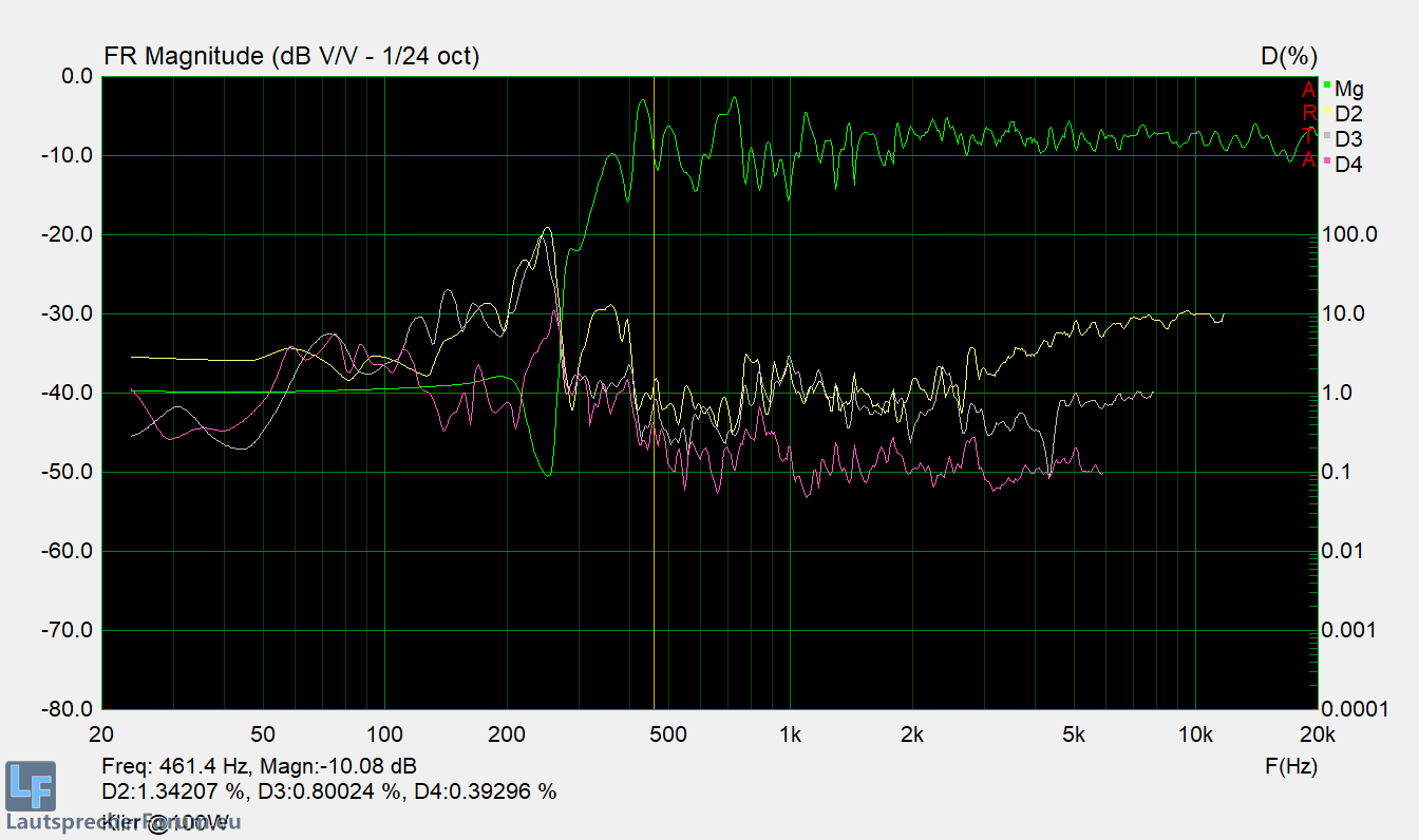 Neben dem Ausschwingverhalten besonders interessant sind nun die Verzerrungsmessungen. Mit Rücksicht auf das Chassis wurde eher konservativ gemessen - damit die Bewertung dennoch aussagekräftig im Hinblick auf die spätere Verwendung ist, mit 3 verschiedenen HP-Filtern.